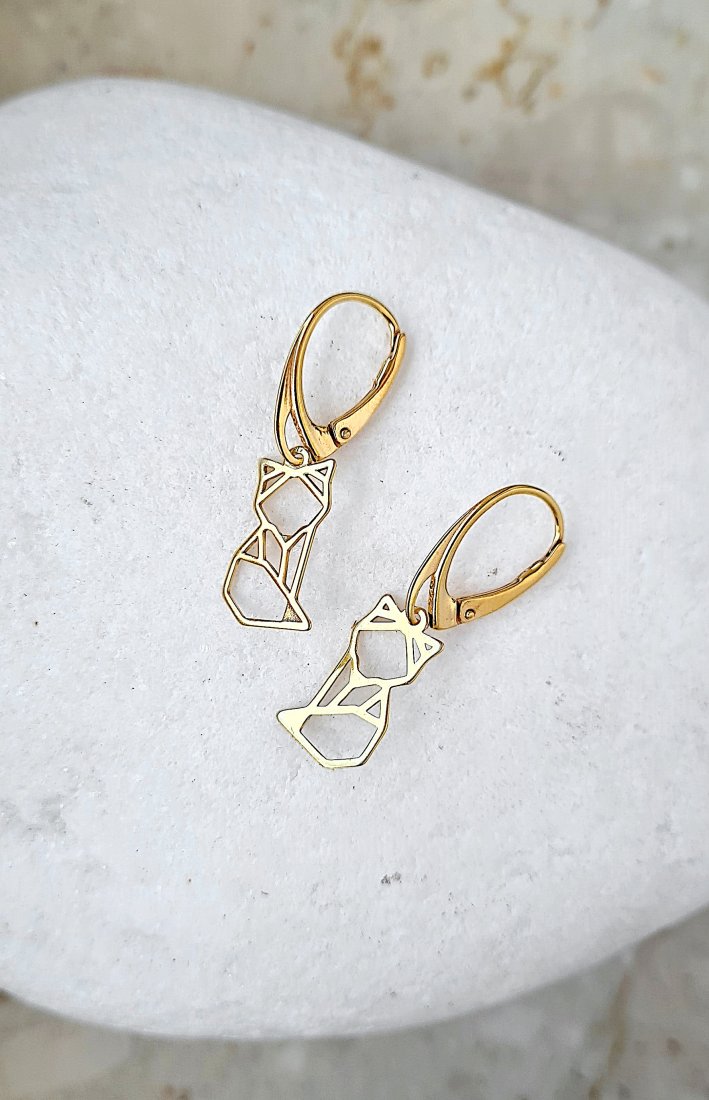 Kolczyki w kształcie geometrycznych lisów / kotów , wykonane ze srebra 925 pokrytego 24KT złotem. Zapinane na bigiel angielski.