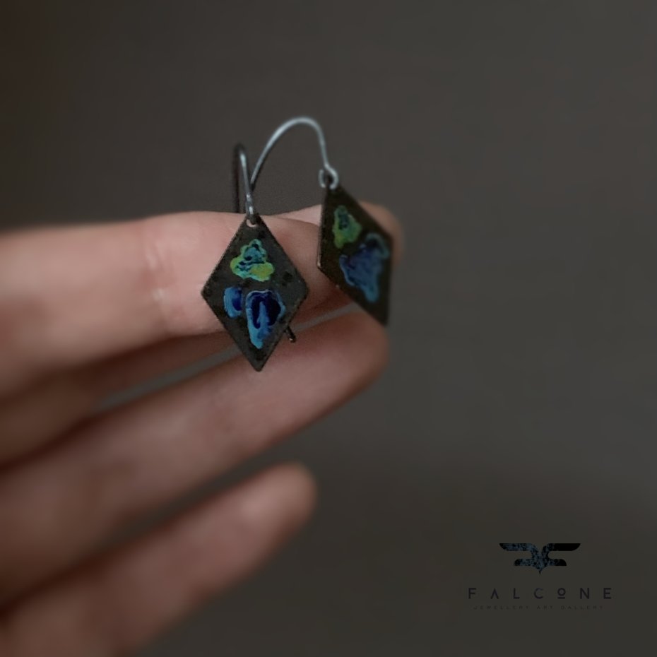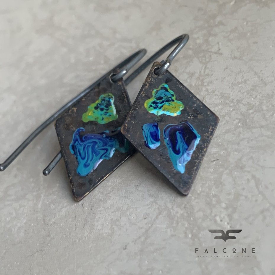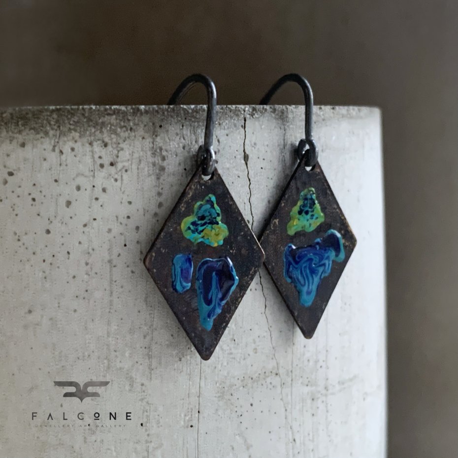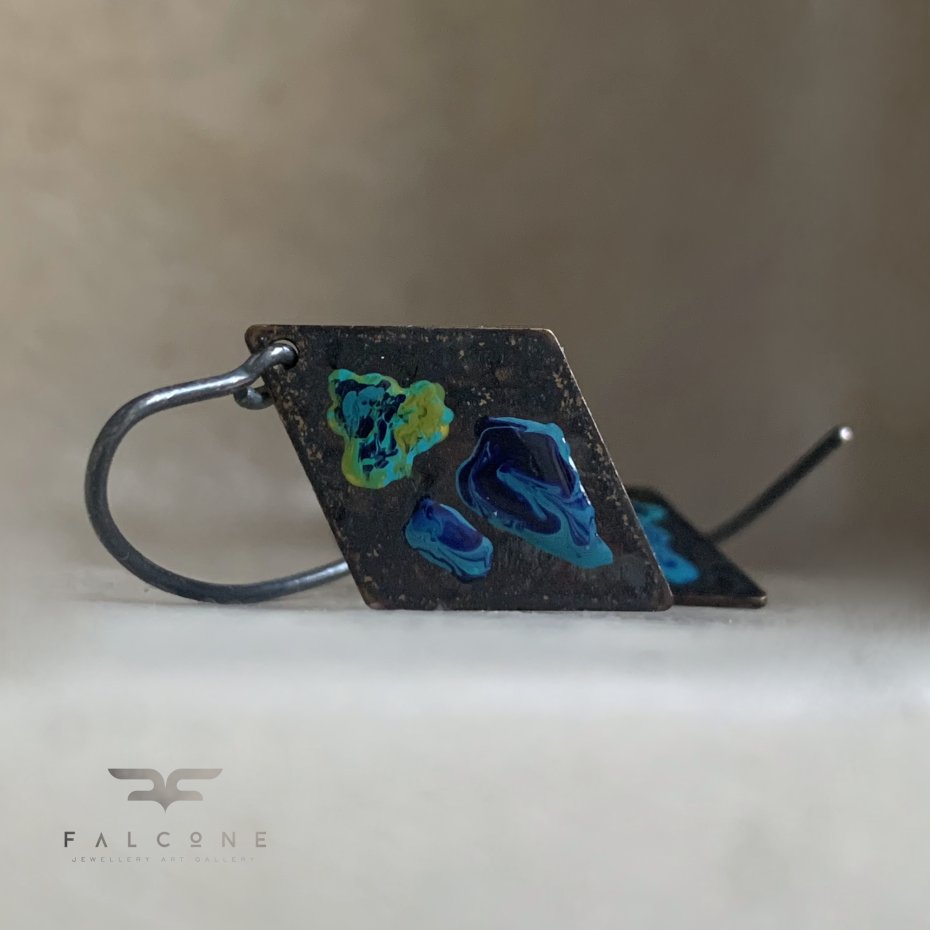 Kolczyki ze srebra i mosiądzu. Patynowany na odcienie brązu mosiądz, zdobiony ręcznie w malowniczy, kwiatowy wzór. Motyw kwiatowy, inspirowany egzotycznymi, nasyconymi barwami natury i jej formami. Patyna ma niejednolity kolor i rustykalny charakter. Kolorystyka kwiatów utrzymana w chłodnych tonacjach, błękitu i ciemnego błękitu z nutami limonkowej zieleni. Bigle typu haki z oksydowanego srebra 925. Szerokość kolczyków to ok. 1,5 cm. Długość kolczyków to ok. 3 cm.