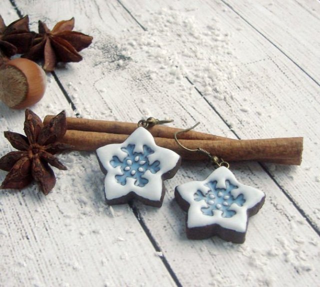 Kolczyki świąteczne pierniczki w kształcie gwiazdek ze śnieżynką i lukrem wykonane ręcznie z masy fimo. Bigle w kolorze starego złota. Wielkość ciastek: 2,5 cm