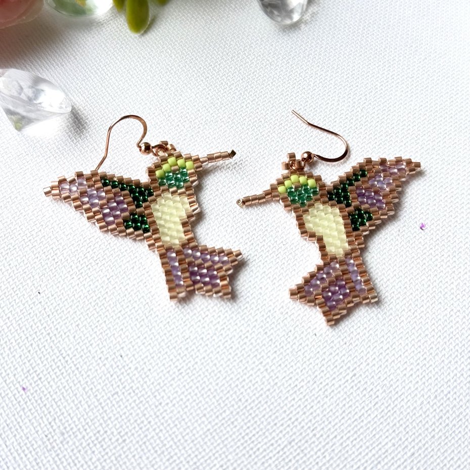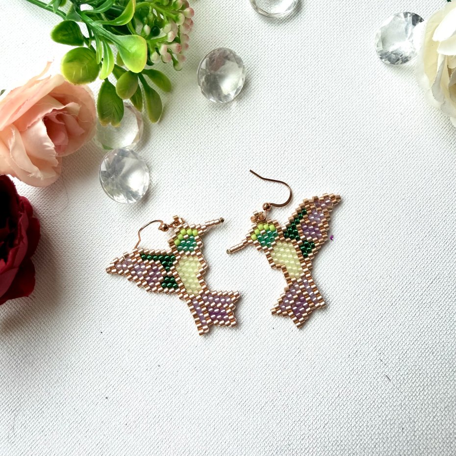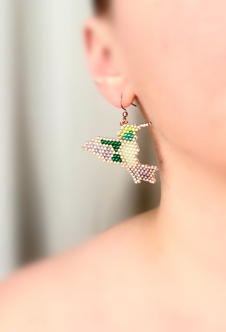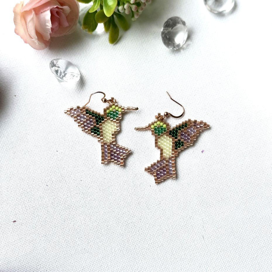 Odkryj urok ręcznie wykonanych kolczyków, które przywołują delikatność i elegancję natury. Te wyjątkowe kolczyki, stworzone z mnóstwa koralików , przedstawiają kształt kolibra – symbolu radości i lekkości. Każdy detal został starannie wykonany z koralików w pastelowych odcieniach: delikatnej zieleni, różowego złota oraz subtelnego fioletu, co nadaje im niepowtarzalny, kobiecy charakter.