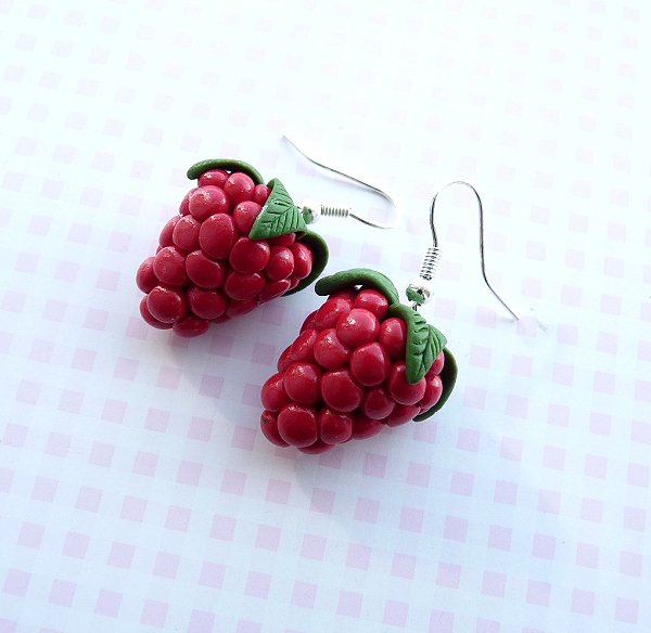 Urocze kolczyki z miniaturowymi malinkami:) wysokość maliny: ok. 2cm, długość kolczyka: ok.4cm. Wysyłam ozdobnie zapakowane;)