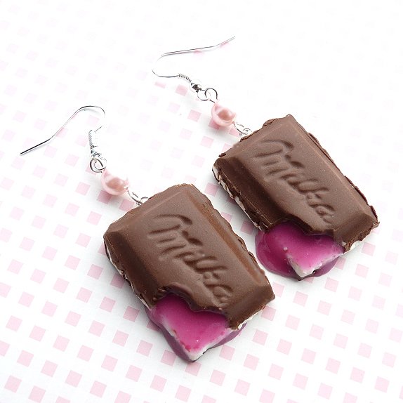 Urocze kolczyki - miniaturowe nadgryzione czekoladki z wypływającym nadzieniem o smaku malinowym:) wymiary czekoladki: ok.3x2cm, długość całkowita kolczyka: ok. 5,5-6cm. Wysyłam ozdobnie zapakowane;)