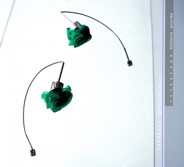 Niezwykłe, ekscentryczne kolczyki w kolorze ciemnej, butelkowej zieleni. Fantastycznie prezentują się na uchu, wobec czego stanowić będą niepowtarzalną ozdobę każdej Pani .Ich prosta, minimalistyczna forma zestawiona jest z niebanalnym motywem kwiatowym. Kolczyki wykonane są z oksydowanego srebra. Element, w którym mieści się kwiat został przepolerowany, co nadaje całości eleganckiego charakteru. Kompozycję domykają oryginalne, srebrne zatyczki. Całkowita długość kolczyków wynosi ok. 8 cm. Gorąco polecam!