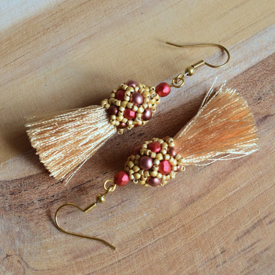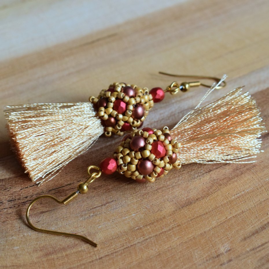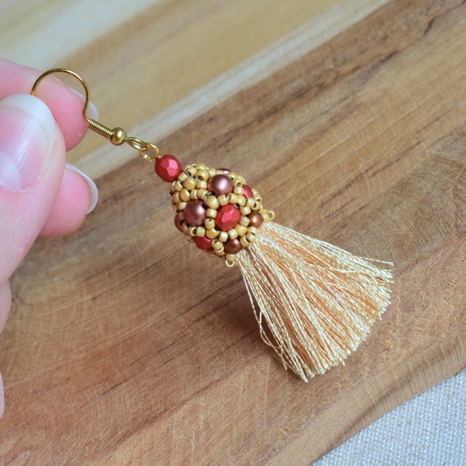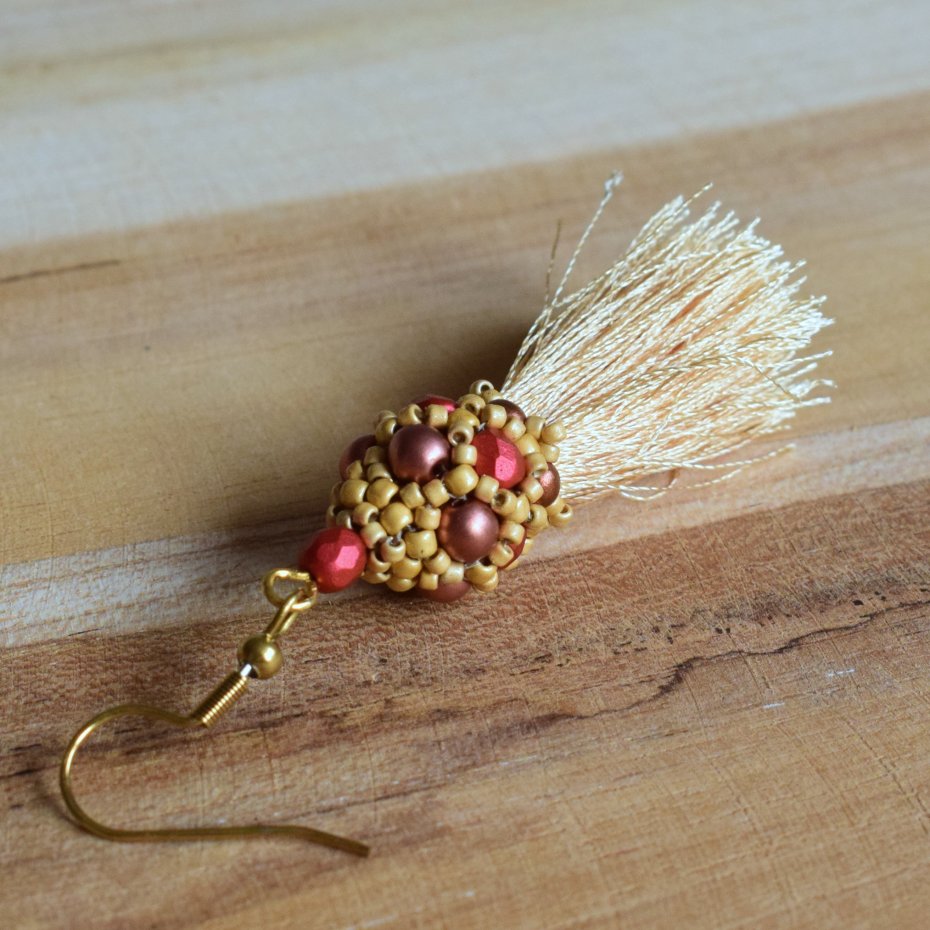 Koronka drobnicy w odcieniu satynowego, zgaszonego złota wraz z koralikami tworzy czapeczkę dla jasnozłotego chwosta. Oplecione koraliki to matowe, miedziano-brązowe perełki w dwóch odcieniach oraz jasnoczerwone Fire Polish.