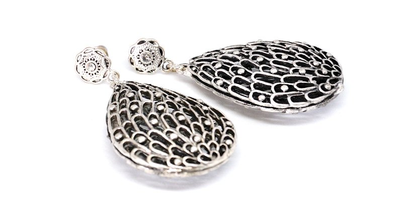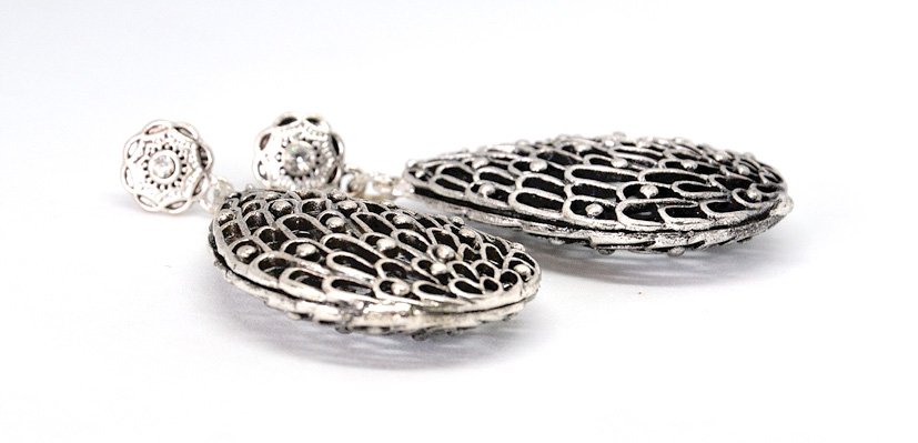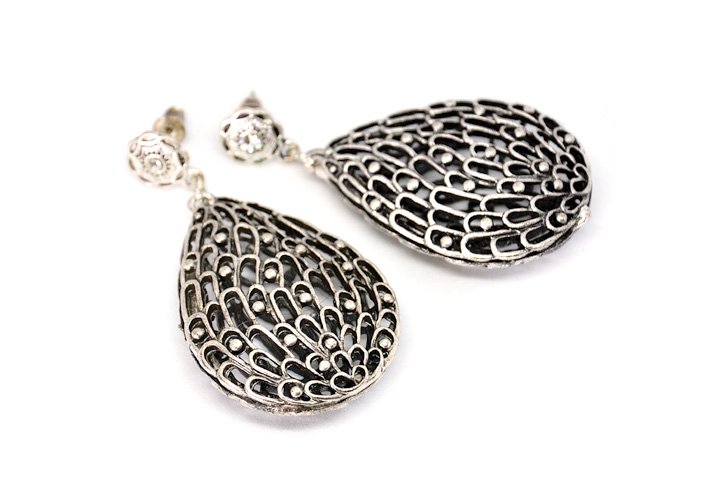 Sporych rozmiarów kolczyki wykonane z dużych, ażurowych zawieszek w kształcie kropel. Zawieszki typu Bali (z metalu w odcieniu starego srebra).