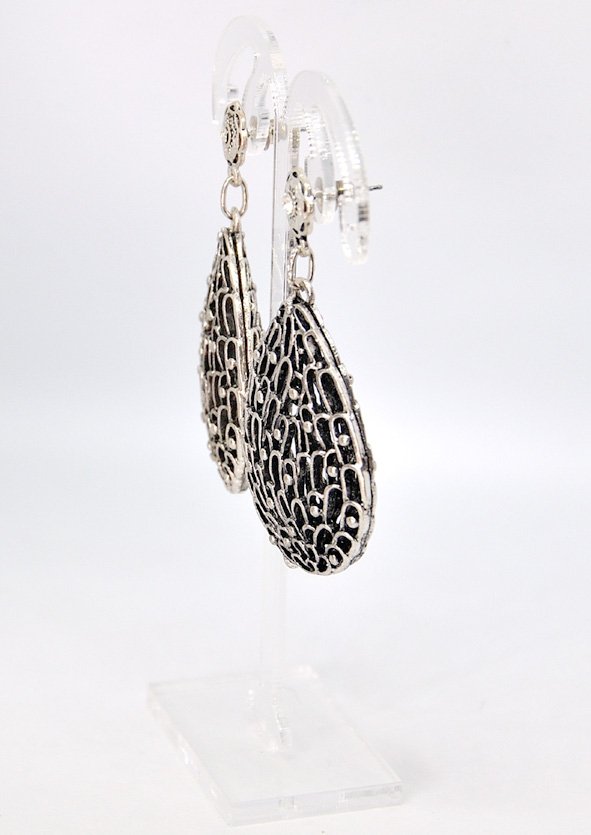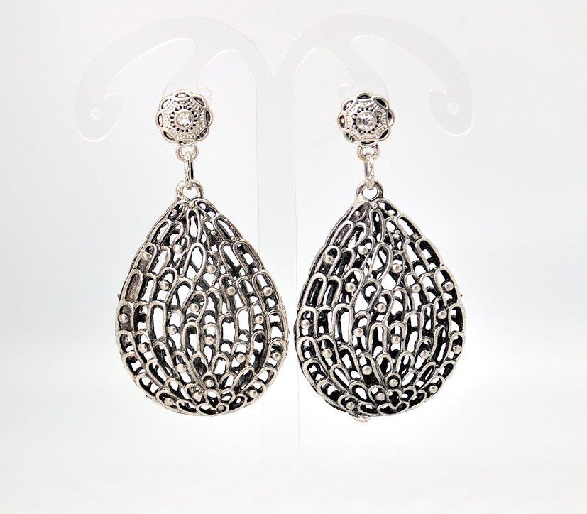 Sporych rozmiarów kolczyki wykonane z dużych, ażurowych zawieszek w kształcie kropel. Zawieszki typu Bali (z metalu w odcieniu starego srebra).