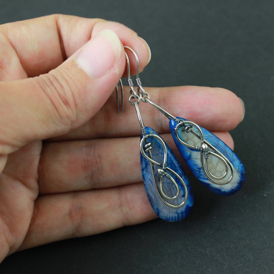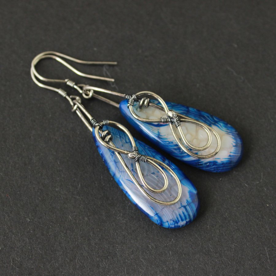 W tych kolczykach zaklęto fragment pejzażu, jakby kropla nieba spłynęła po powierzchni kamienia i zatrzymała się tuż przed zetknięciem z ziemią. Niebieski agat, wydłużony i smukły, układa się w kształt kropli rozciągniętej przez wiatr – z delikatnym przejściem od głębokiego kobaltu po mlecznobiałe centrum, które przywodzi na myśl poranną mgłę unoszącą się nad taflą jeziora. W jego strukturze migoczą drobne żyłki: jedne ostre jak pęknięcia lodu, inne miękkie, rozlewające się niczym akwarela.