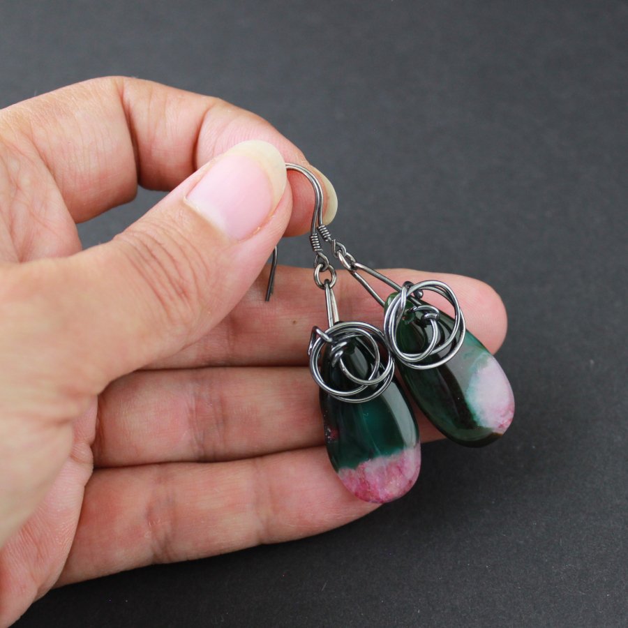 W tych kolczykach zamknięto opowieść o spotkaniu nocy z porankiem. Wydłużone krople agatu (5,6 cm długości, 1,5 cm szerokości) przechodzą z głębokiej, leśnej zieleni w malinowy róż i mleczną biel, jakby kamień zatrzymał w sobie chwilę, gdy pierwsze promienie słońca dotykają mchu i rosy. Zieleń, pełna tajemnicy i spokoju, miesza się tu z delikatnym różem przypominającym płatki magnolii, a mleczne przejścia łagodzą kontrasty, tworząc harmonijną, organiczną kompozycję.