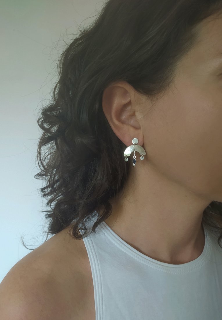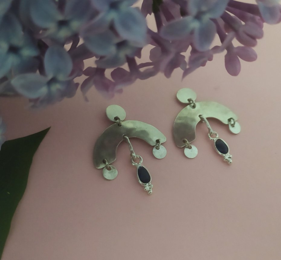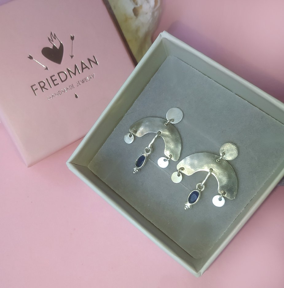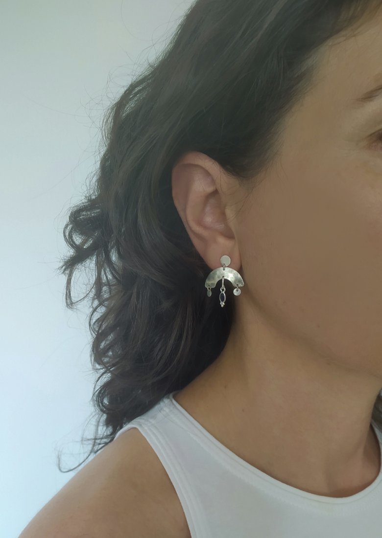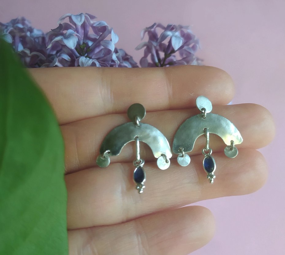 Kolczyki wykonane w całości ręcznie ze srebra pr. 925 oraz naturalnych kamieni szafirów szlifowanych w kolorze granatowym .