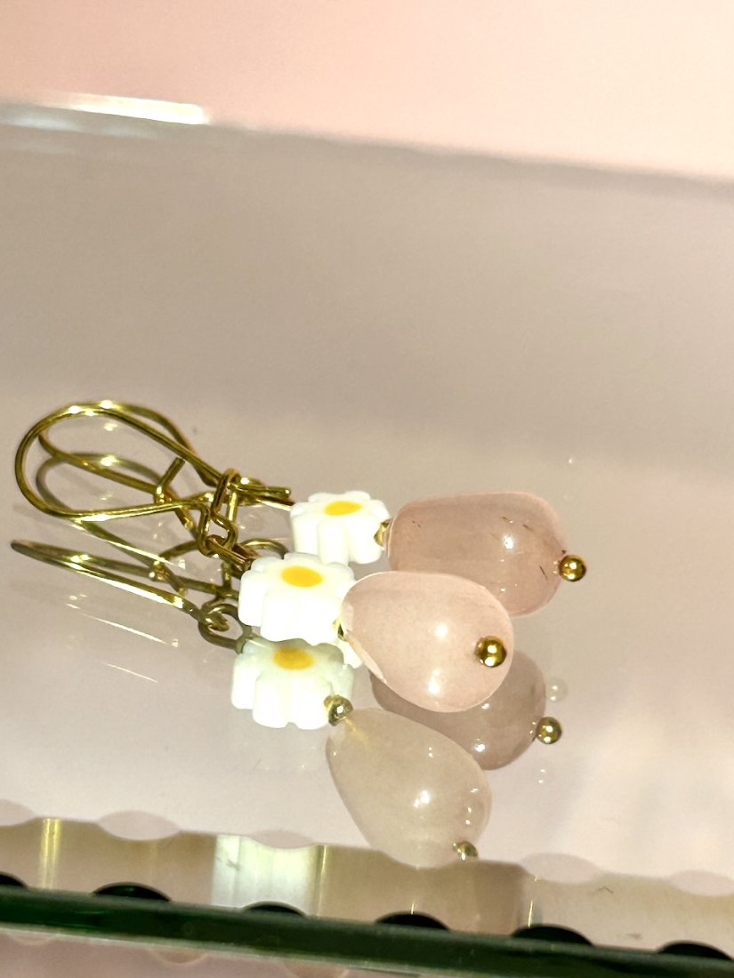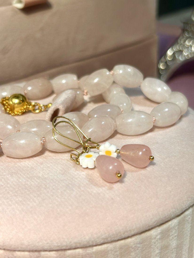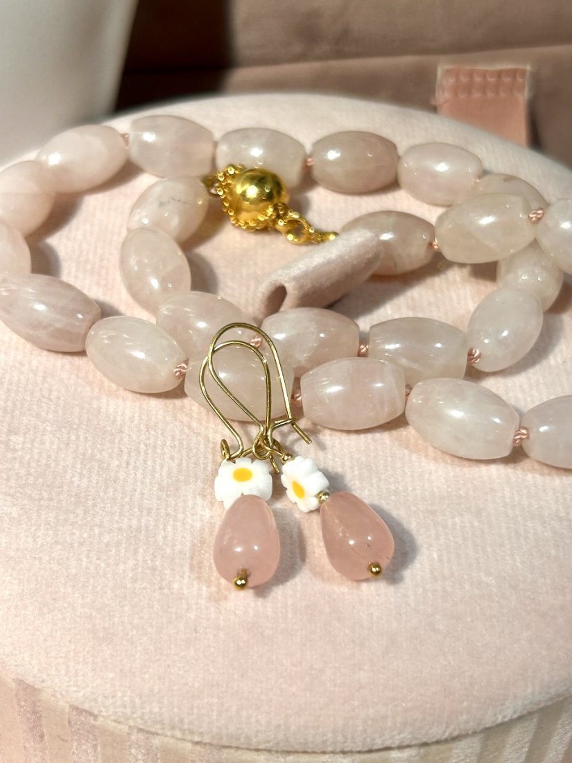 Kamienie w pięknym kolorze pudrowego różu, nie mam pewności czy jest to kwarc różany czy agat.