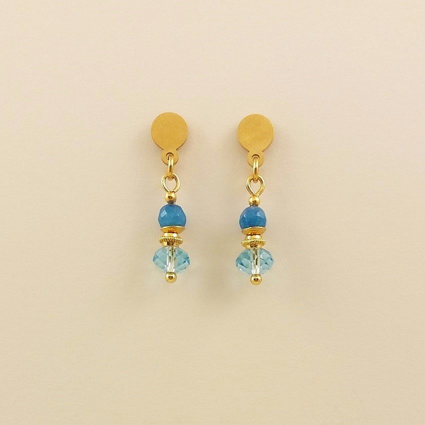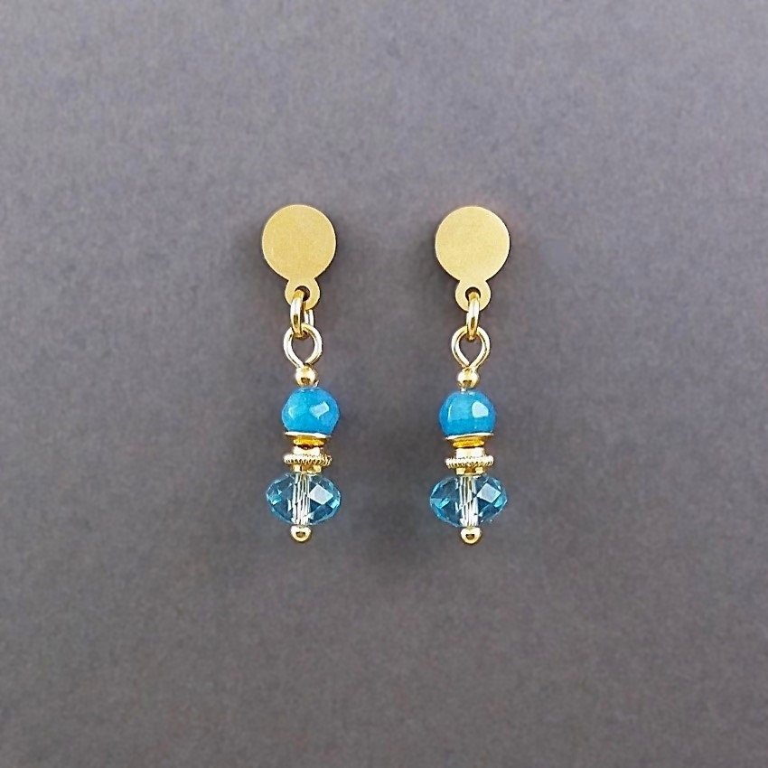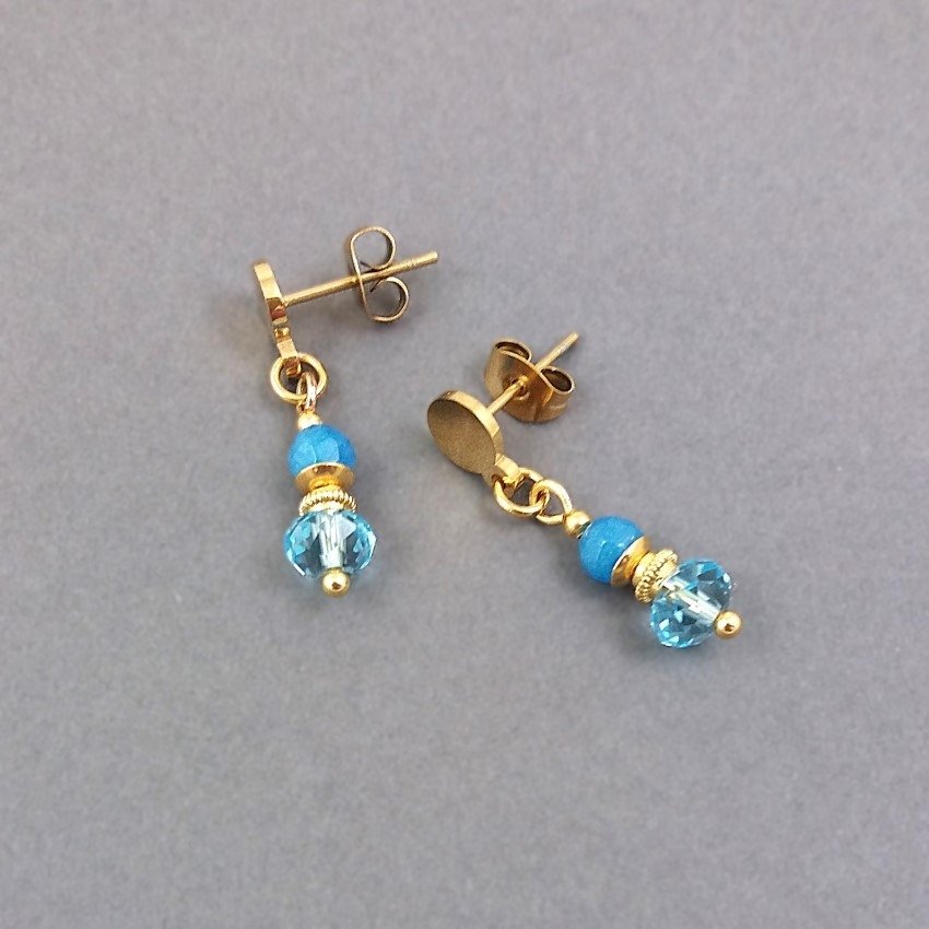 Delikatne kolczyki z nieuczulającej, pozłacanej stali szlachetnej. Na okrągłych sztyftach o średnicy 6 mm, zawieszone są błękitne, pięknie odbijające światło kryształki Swarovskiego, o średnicy 6 mm i niebieskie, fasetowane kulki z jadeitu.