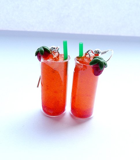 Urocze kolczyki - miniaturowe drinki z sokiem truskawkowym, kawałkami truskawek i kostkami lodu:) wysokość szklanki: 2,5cm, długość całkowita kolczyka: ok. 4,5cm. Kolory rureczek w szklaneczkach dobierane są losowo. Wysyłam ozdobnie zapakowane;)