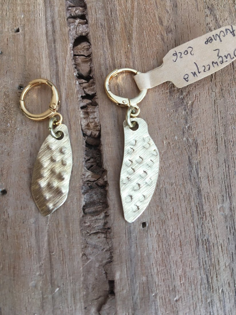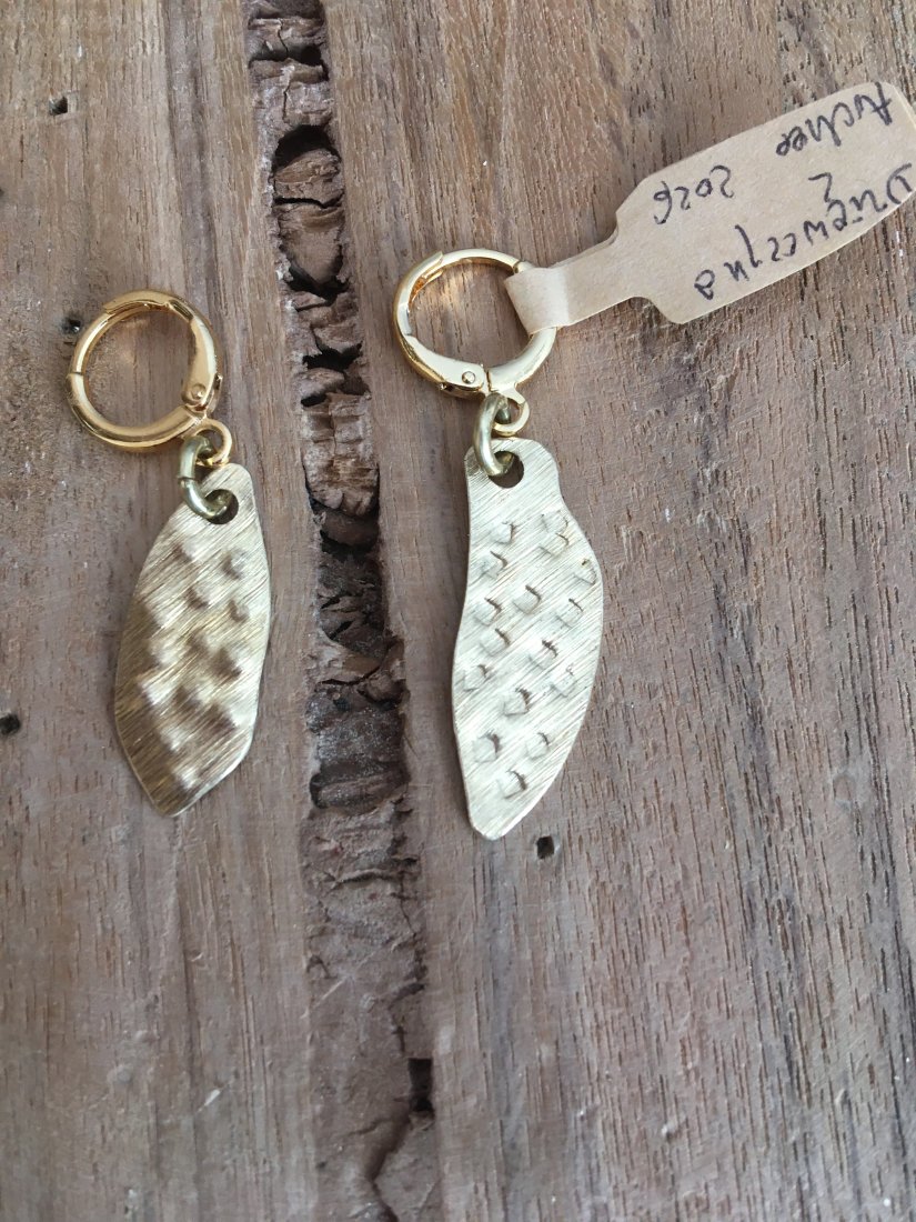 Tworzywo : mosiądz o właściwościach przeciwzapalnych . Rękodzieło . Są bardzo lekkie I delikatne. Zostaną zapakowane na prezent.
