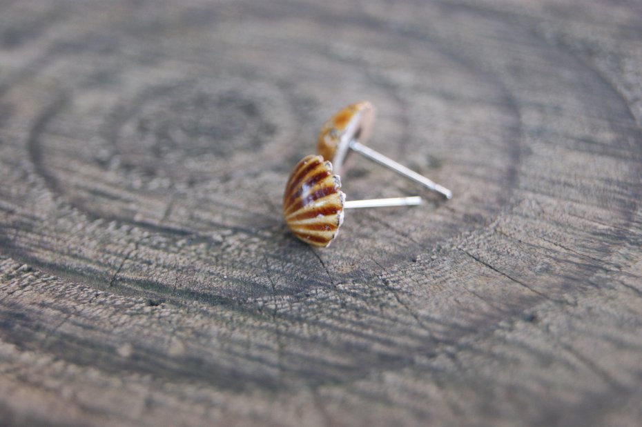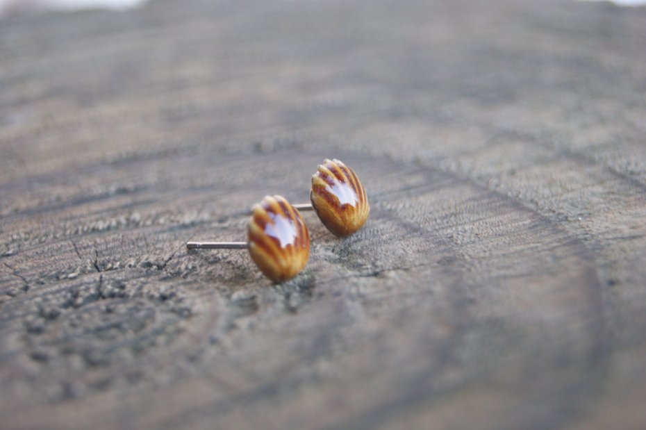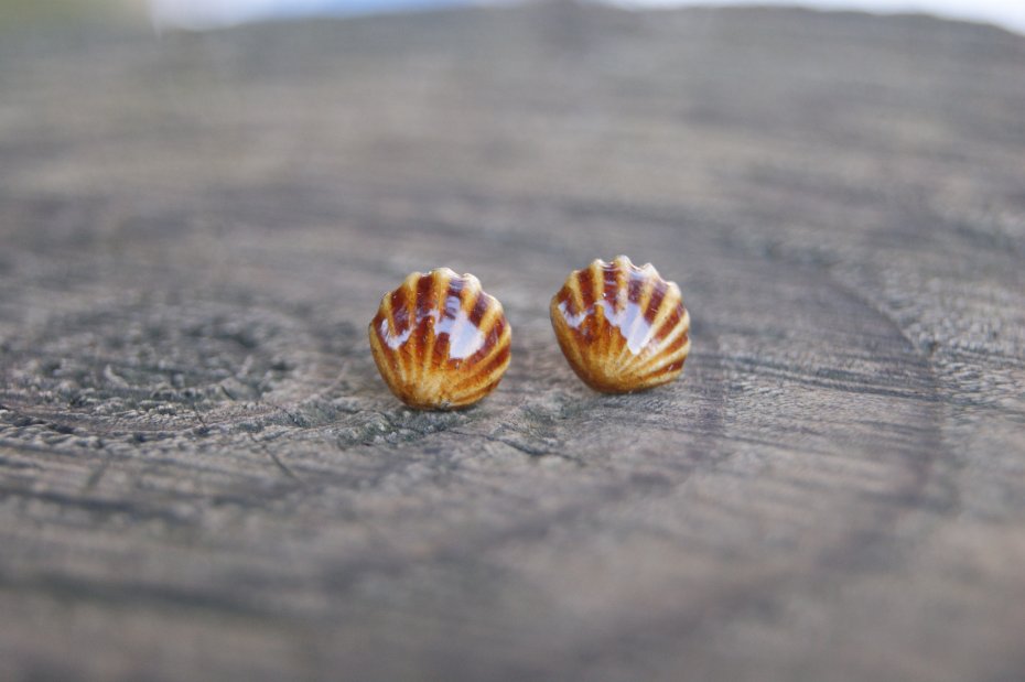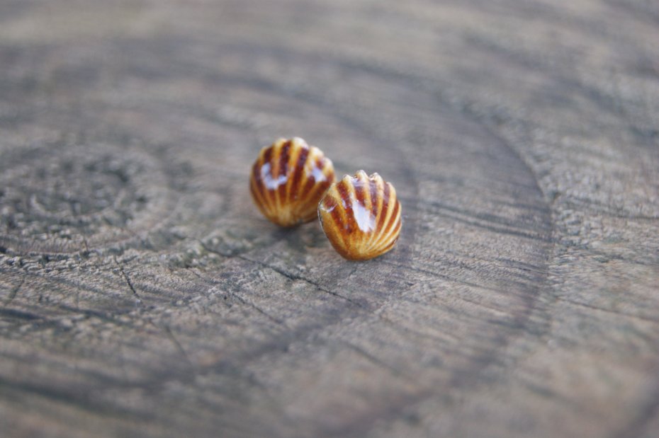 Poznaj ceramiczne kolczyki "Bursztynowy Brzeg" inspirowane ciepłym piaskiem i nadmorskim bursztynem. Delikatne muszelki o naturalnym kształcie zostały ręcznie wykonane z jasnej, lekkiej gliny i pokryte brązowym, błyszczącym szkliwem, które pięknie odbija światło i nadaje im głębi.