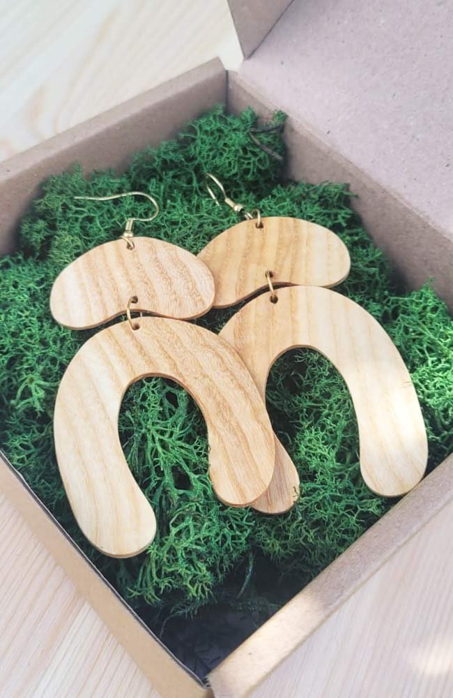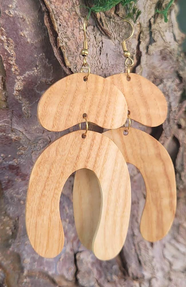 Kolczyki o organicznym kształcie wykonane ręcznie z drewna jesionowego lub z egzotycznego drewna cumaru (do wyboru). Elementy drewniane starannie szlifujemy i zabezpieczamy olejem.