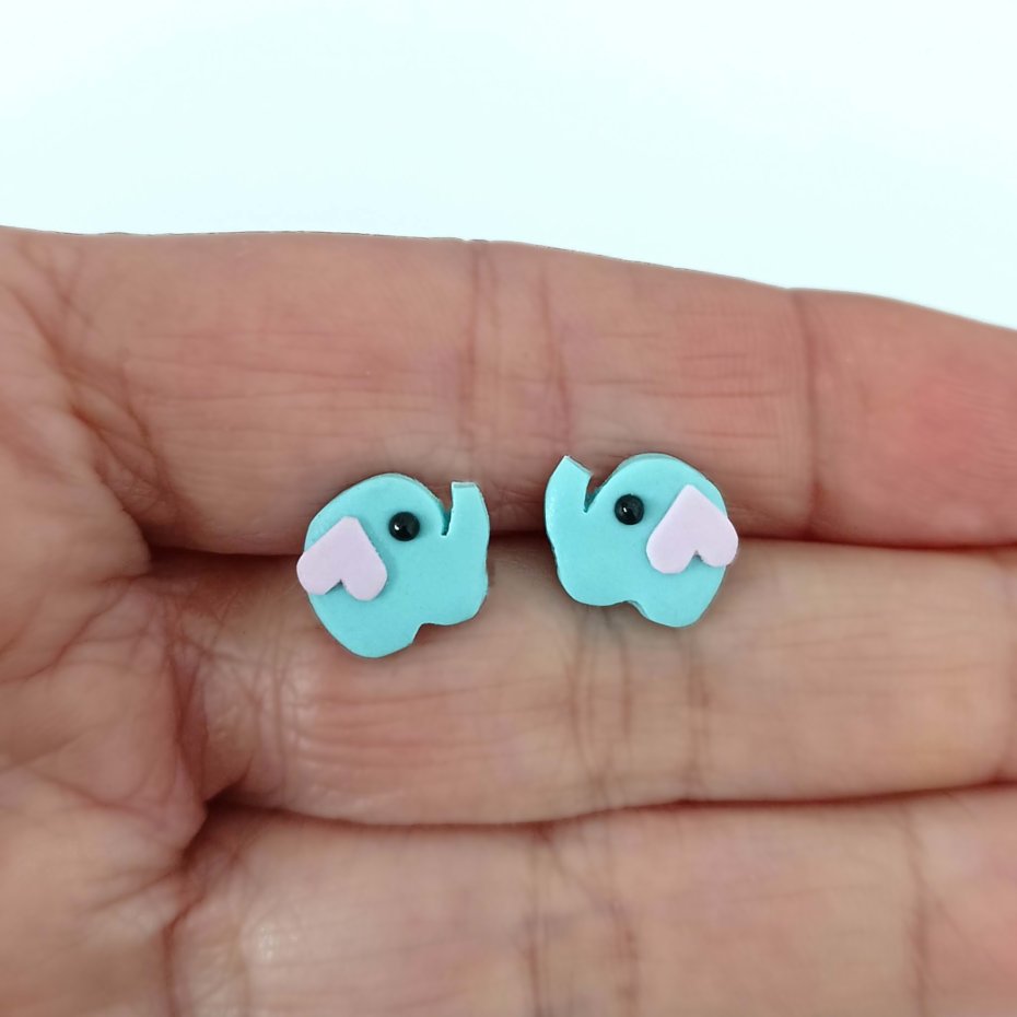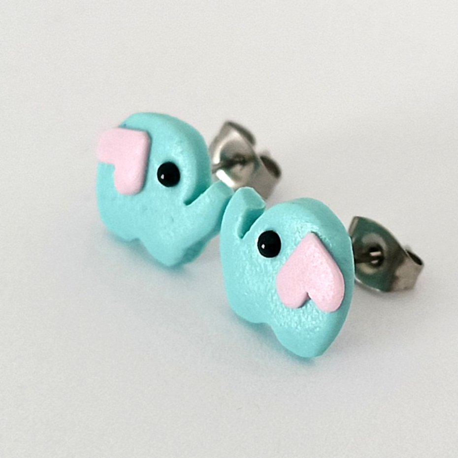 Urocze kolczyki w kształcie małych słoników w niebieskim kolorze z różowymi serduszkami.