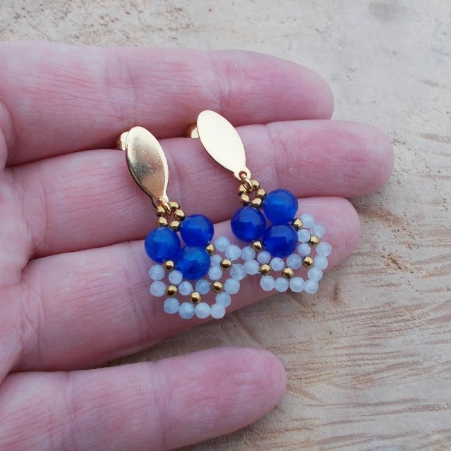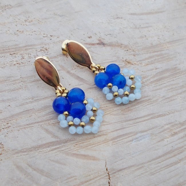 Krótkie, lecz efektowne kolczyki wykonane ze stali chirurgicznej w kolorze złotym oraz kulek jadeitu niebieskiego i akwamarynu. Zawieszone na sztyftach, zatyczki w komplecie.