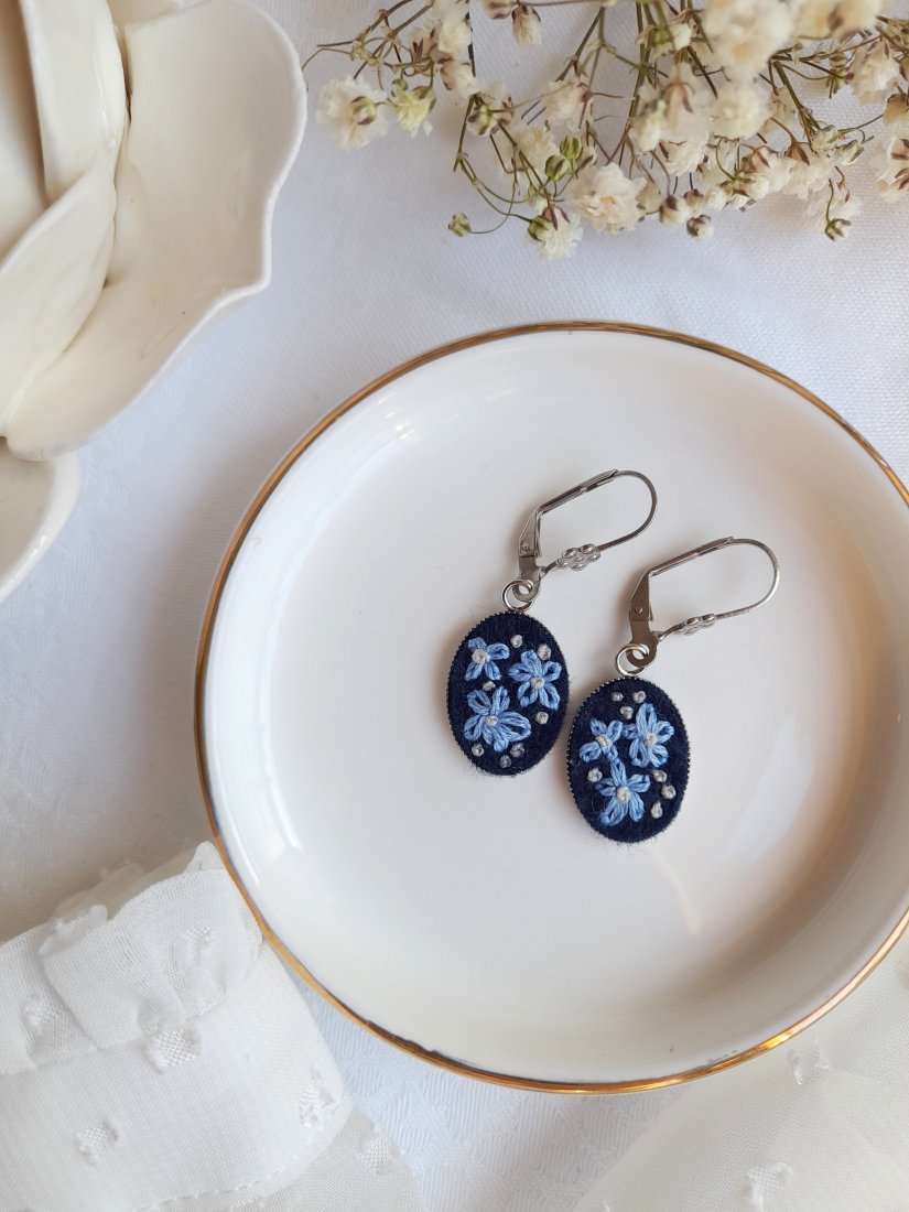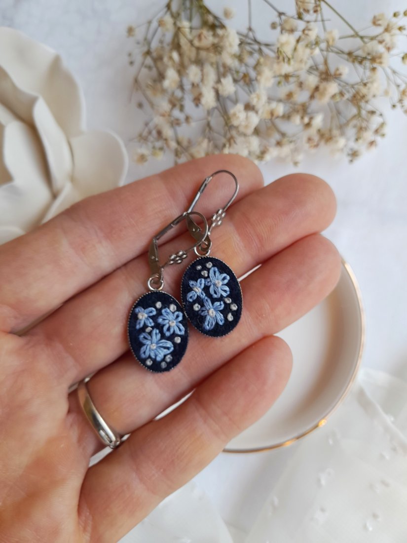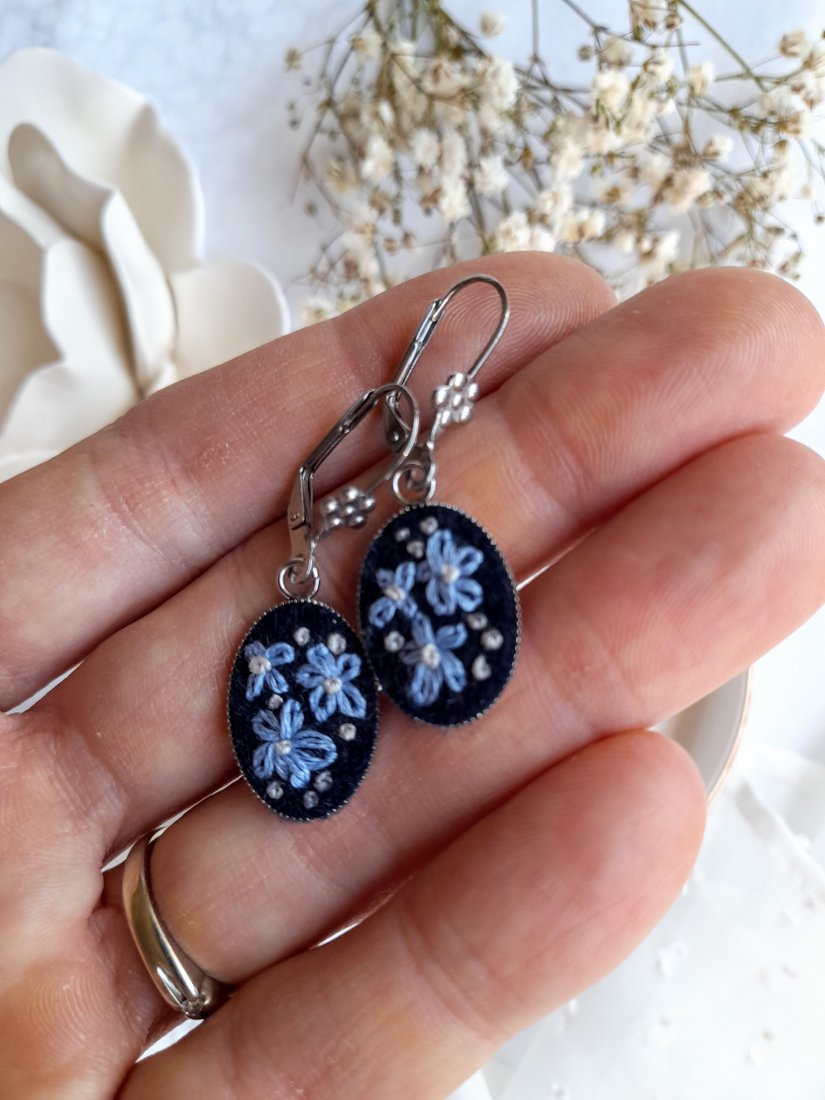 Delikatne, lekkie, haftowane ręcznie kolczyki z niezapominajkami w kolorze jasnego błękitu na ciemnym tle dla wielbicielek niepowtarzalnej kwiatowej biżuterii.