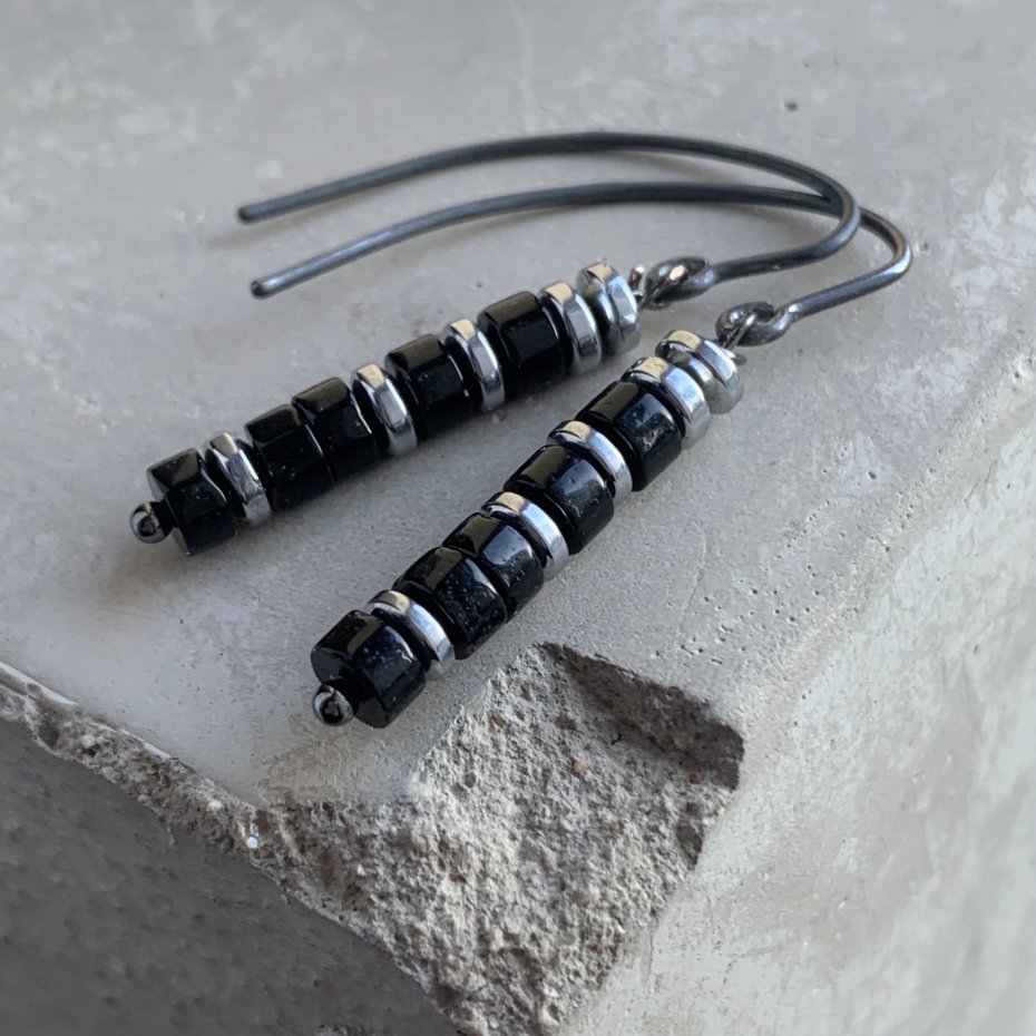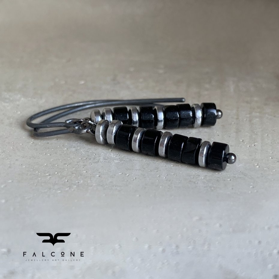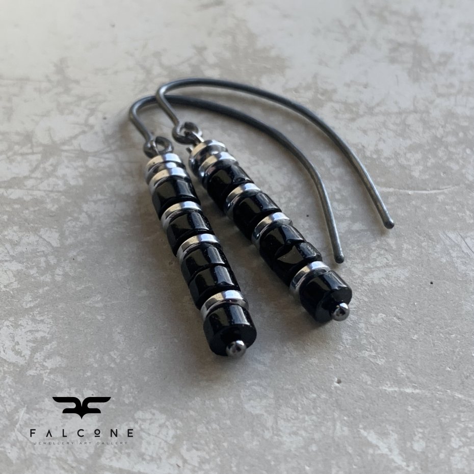Kolczyki ze srebra i kamieni. Kolczyki w formie prostych kolumn, z czarnego onyksu. Dostojną, monochromatyczną, czarną barwę kamieni przełamują platerowane srebrem hematyty. Onyks jest polerowany. Kamień naturalny, posiada niedoskonałości. Całość zawieszona na prostych biglach. Bigle typu haki ze srebra 925. Średnica kamieni to ok. 4 mm. Długość kolczyków to ok. 3,5 cm.