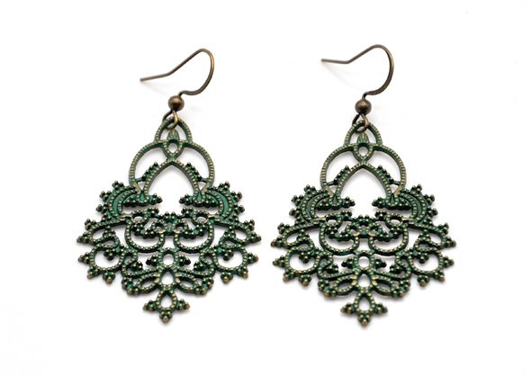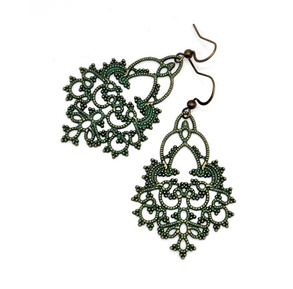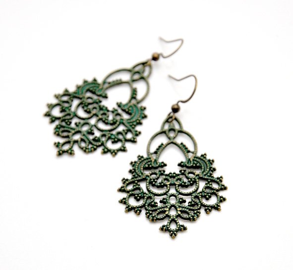 Kolczyki wykonane z mosiądzu antycznego, pokryte zieloną patyną. Misterne, filigranowe. Boho.