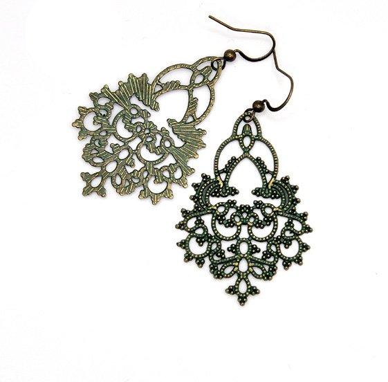 Kolczyki wykonane z mosiądzu antycznego, pokryte zieloną patyną. Misterne, filigranowe. Boho.