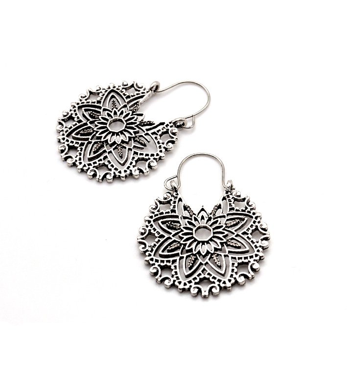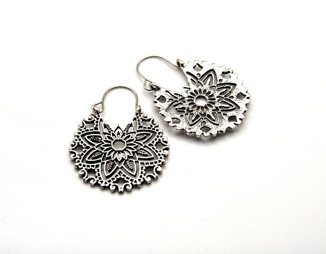 Niewielkie kolczyki wykonane z metalu - w kolorze mocno postarzanego srebra. Bogate, ażurowe, filigranowe. Wzór znajduje się z jednej strony. Zwracają uwagę.