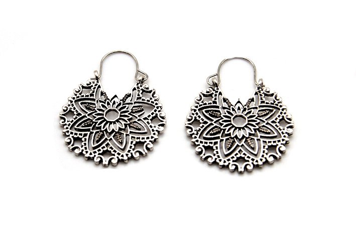 Niewielkie kolczyki wykonane z metalu - w kolorze mocno postarzanego srebra. Bogate, ażurowe, filigranowe. Wzór znajduje się z jednej strony. Zwracają uwagę.