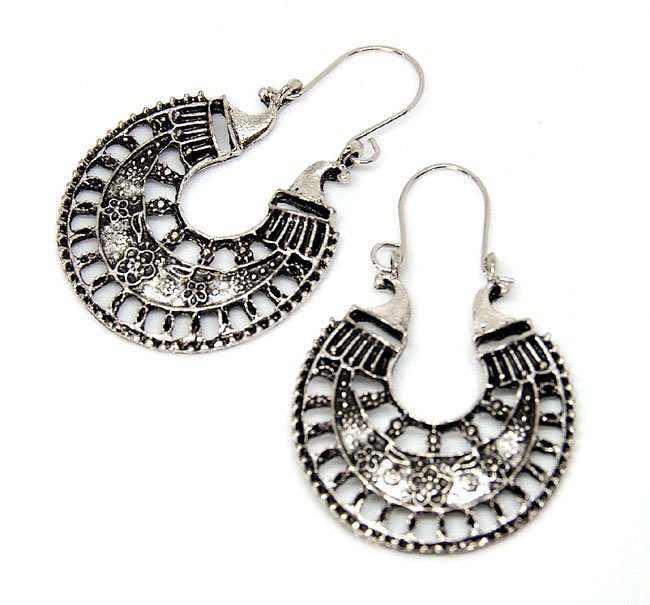 Orientalne, okrągłe kolczyki wykonane z metalu - w kolorze mocno postarzanego srebra. Bogate, ażurowe, filigranowe. Wzór znajduje się z jednej strony. Zwracają uwagę.