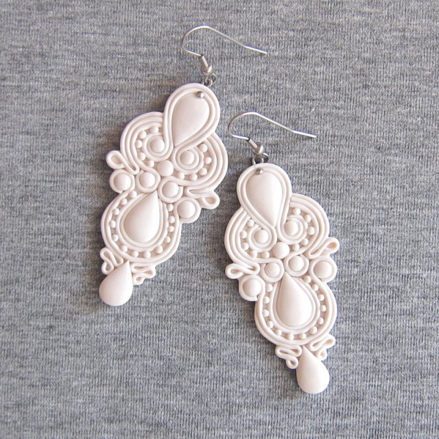 Orientalne kolczyki wykonane z białej masy termoutwardzalnej Fimo i z wysokiej jakości bigli ze stali. Wielkość kolczyków bez bigli to ok. 5,5 cm, z biglami ok. 7 cm. Kolczyki są lekkie i bardzo solidnie zrobione. Kolczyki są bardzo uniwersalne. Świetnie pasują zarówno do zwykłej koszulki i dżinsów jak i do sukni ślubnej:)