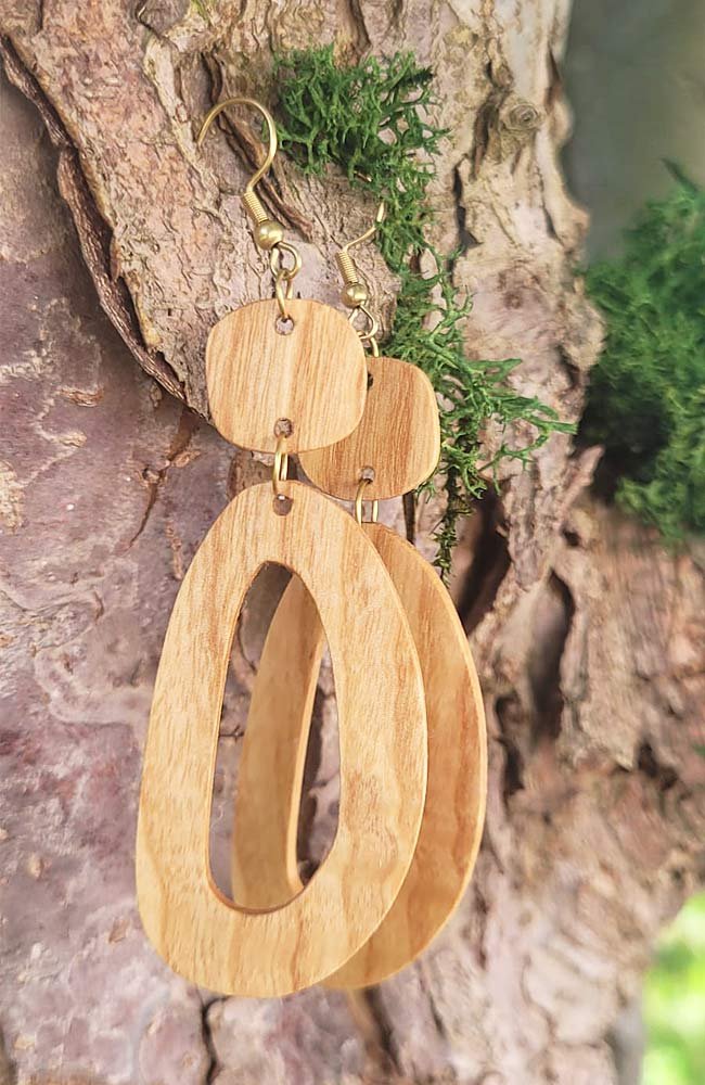 Długie, wiszące kolczyki wykonane ręcznie z drewna jesionowego lub z egzotycznego drewna cumaru (do wyboru). Elementy drewniane starannie szlifujemy i zabezpieczamy olejem.