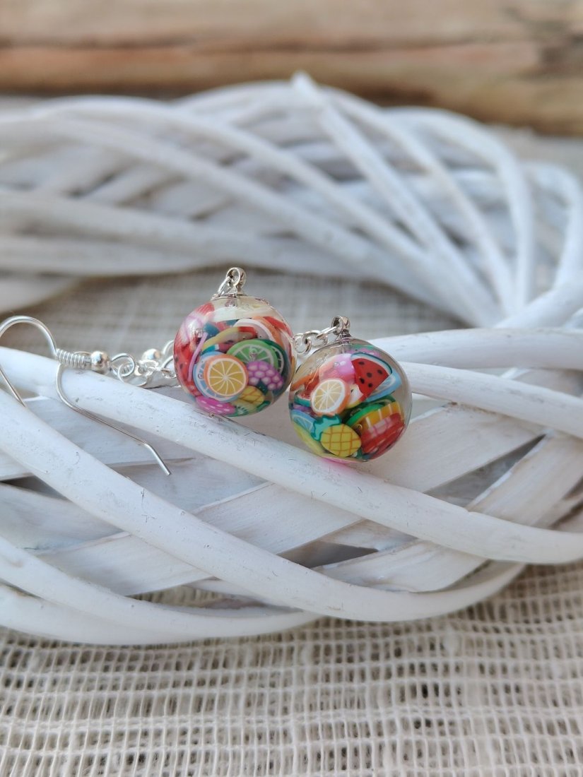- Motyw: kolorowe miniaturowe owoce zatopione w żywicy