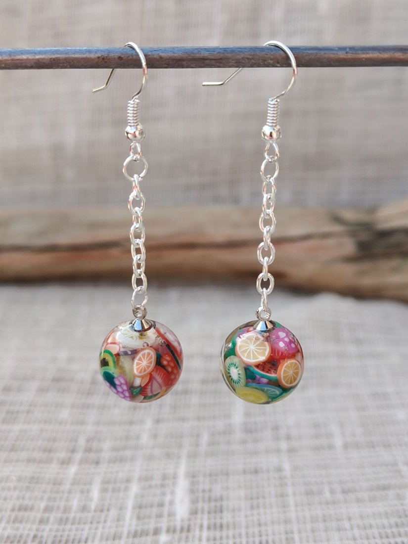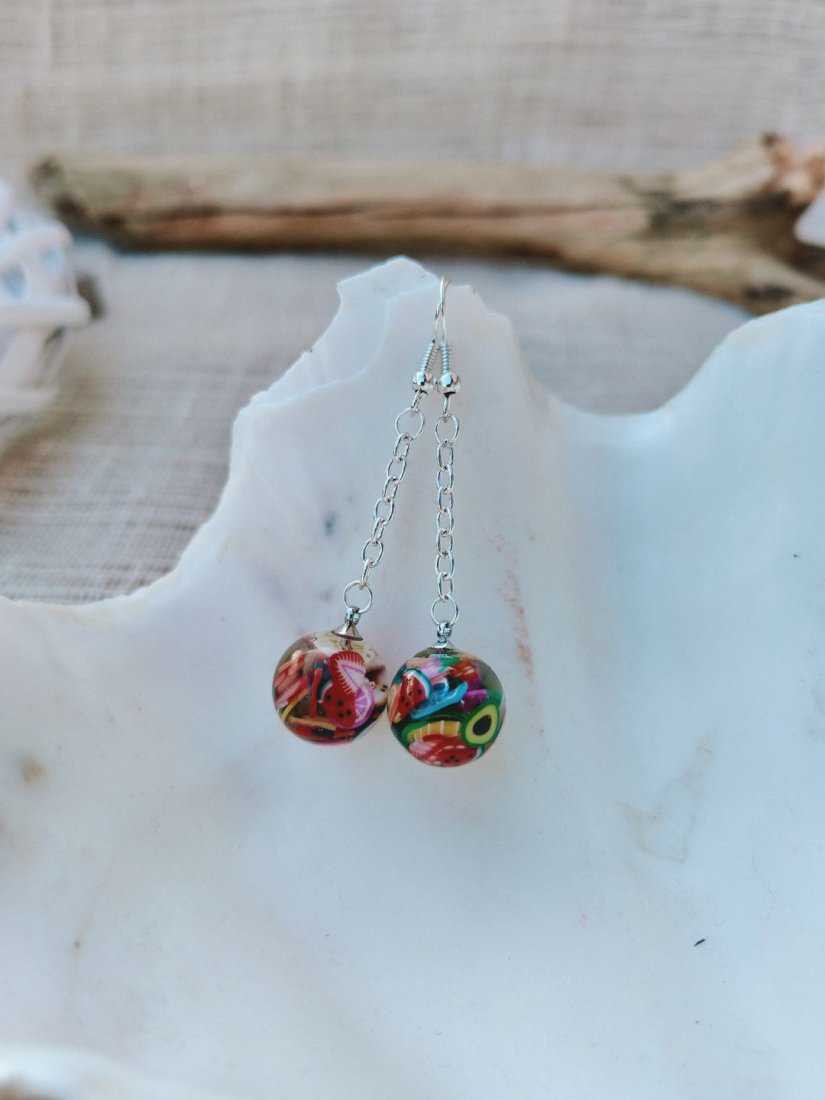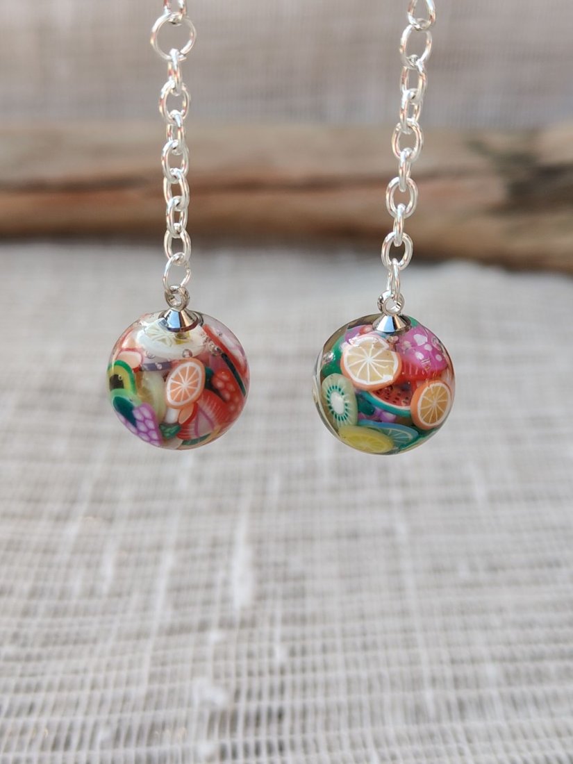 Zachwycające, lekkie kolczyki wykonane z wysokiej jakości żywicy, w których zatopiono miniaturowe, kolorowe motywy owocowe. Każda para to małe dzieło sztuki – pełne detali, barw i letniej energii. Transparentna kula pięknie eksponuje wzory, a delikatny łańcuszek dodaje całości lekkości i subtelnego ruchu przy każdym kroku. Idealne dla osób, które lubią oryginalne dodatki i chcą wyróżnić się wyjątkowym stylem.