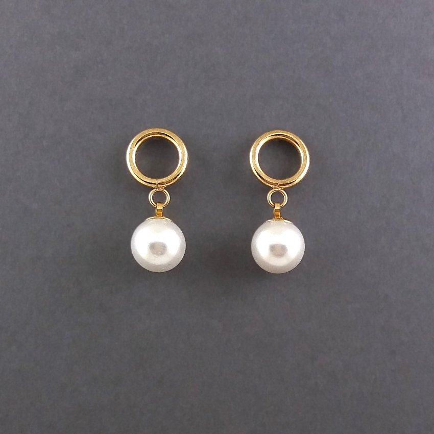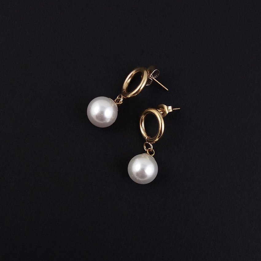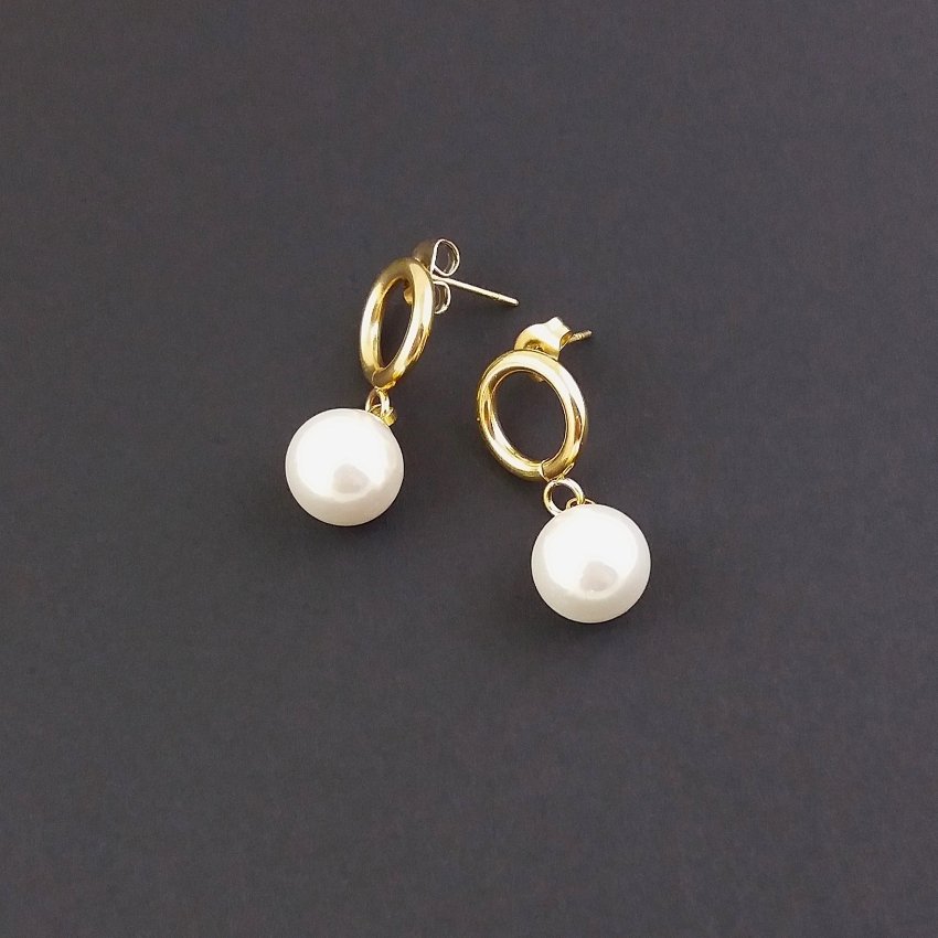 Nowoczesne, proste i bardzo kobiece kolczyki. Na okrągłych sztyftach z nieuczulającej, pozłacanej stali szlachetnej zawieszone są duże perły seashell (muszlowe).
