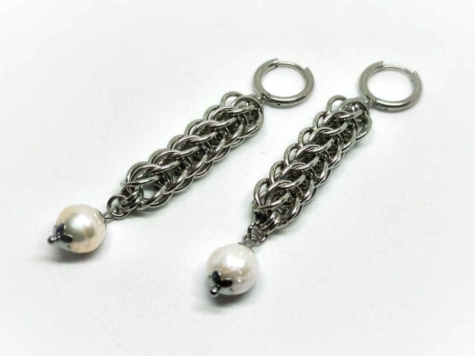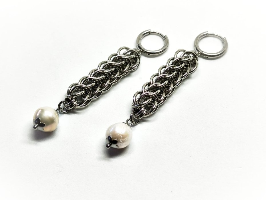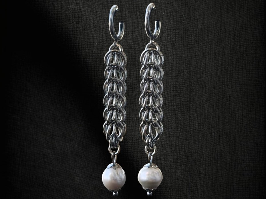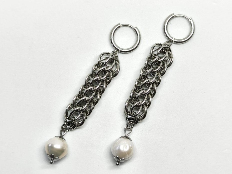 Eleganckie, długie kolczyki chainmaille z naturalnymi perłami słodkowodnymi wplecionymi w stalowy splot – połączenie mrocznej gotyckiej estetyki z delikatnym, organicznym blaskiem pereł. Perły dodają subtelnego, perłowego połysku na tle zimnego metalu, tworząc mistyczny, witchy kontrast, który pięknie się porusza przy każdym ruchu.