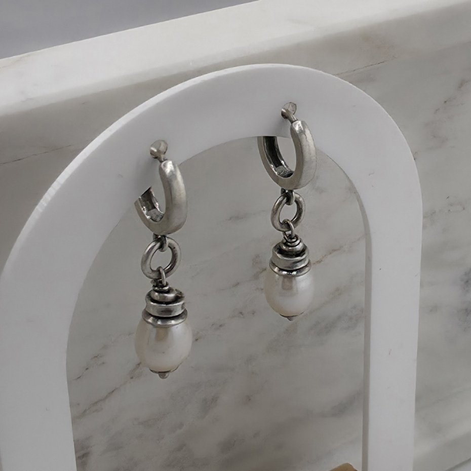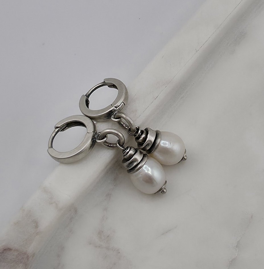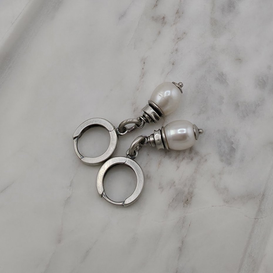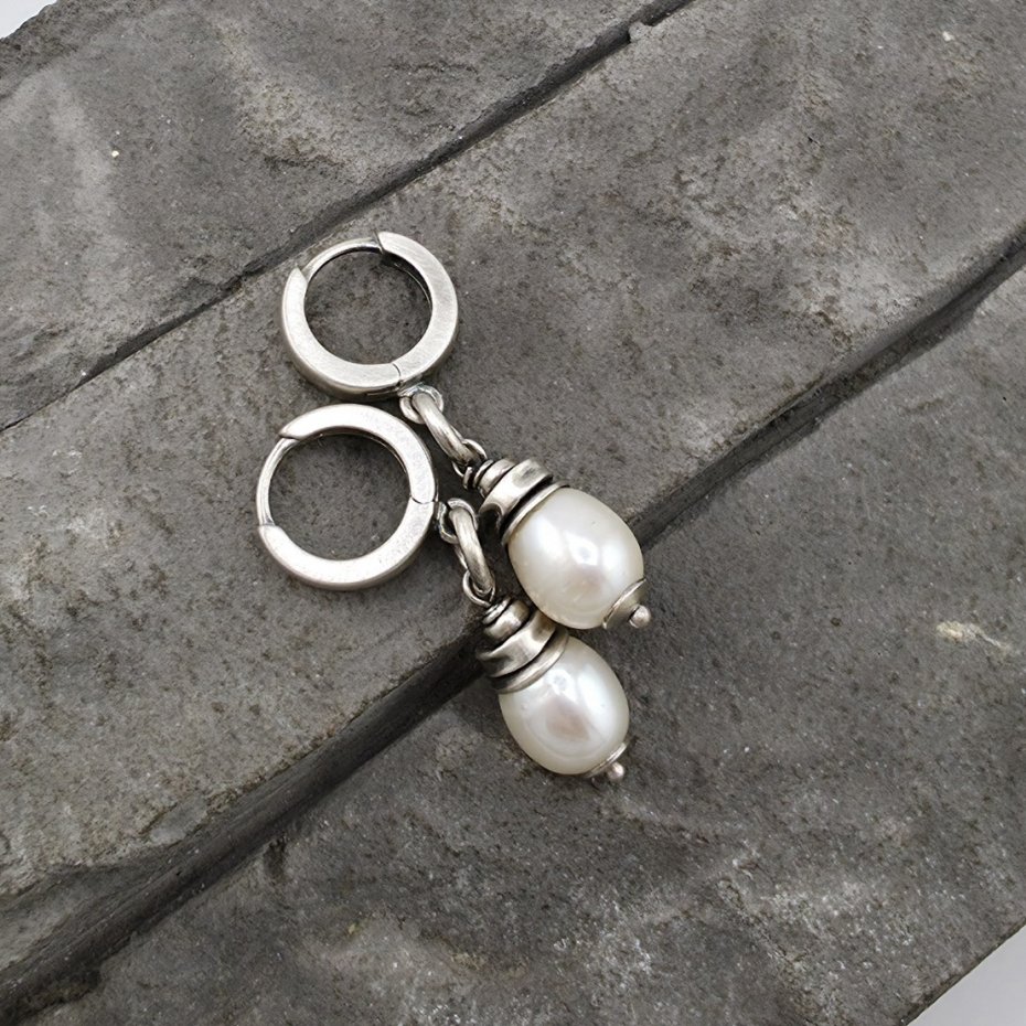 Proste, eleganckie, minimalistyczne kolczyki na co dzień. Wykonane w całości z oksydowanego srebra próby 925 oraz naturalnych, białych pereł słodkowodnych wielkości ok. 0,9 cm. Długość całkowita to ok. 3,5 cm. Bigle typu kajdanki, zatrzaskowe. Na życzenie mogę ich nie oksydowac. W mojej galerii znajduja się podobne kolczyki z innymi kamieniami. Ozdobnie zapakowane.