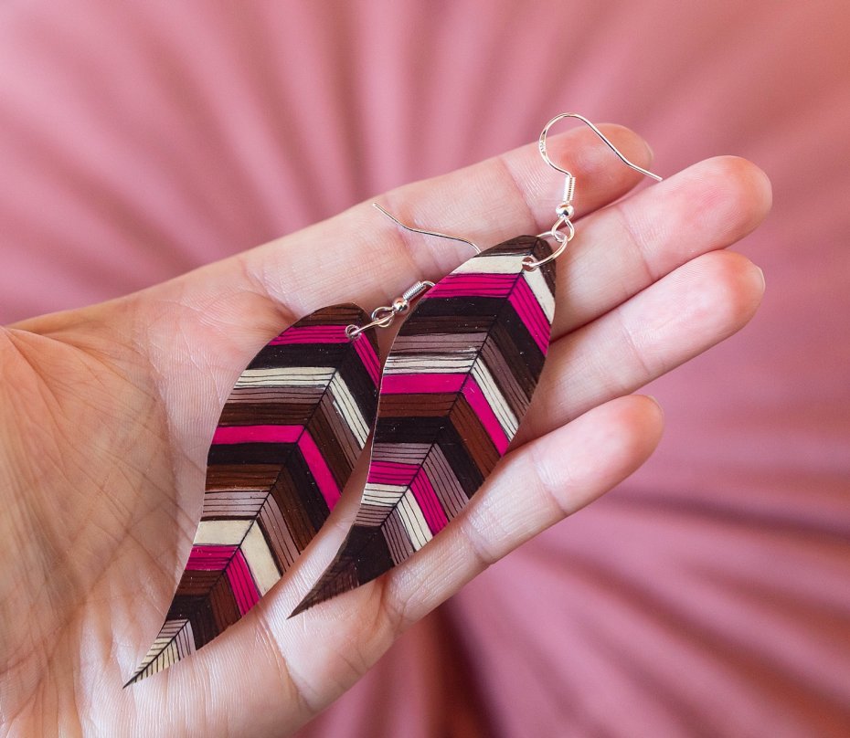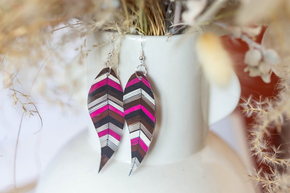Powierzchnia piórek została zabezpieczona kilkoma warstwami błyszczącego lakieru ekologicznego, dzięki czemu kolczyki ładnie mienią się w słońcu.
