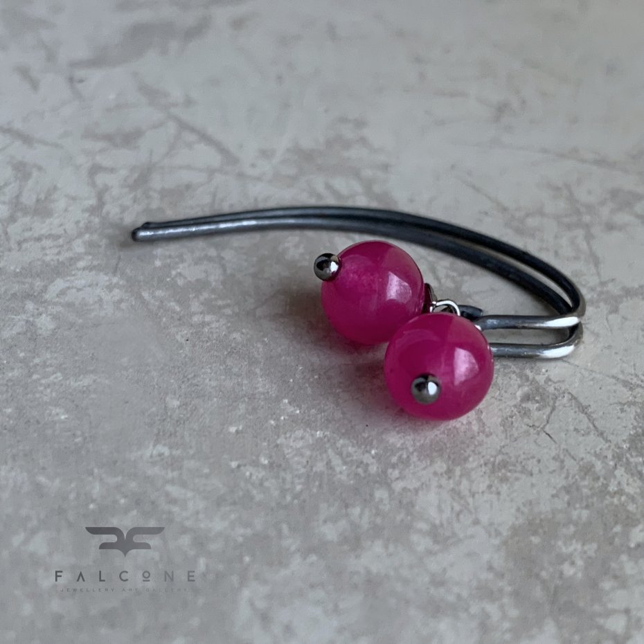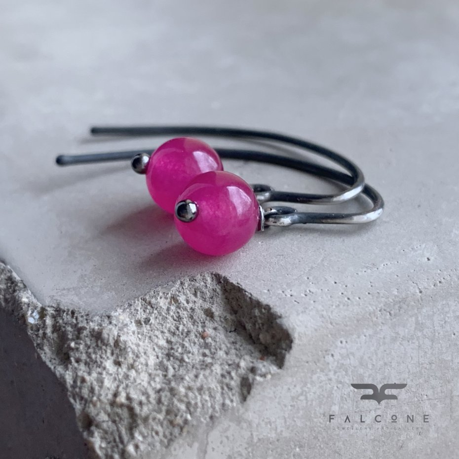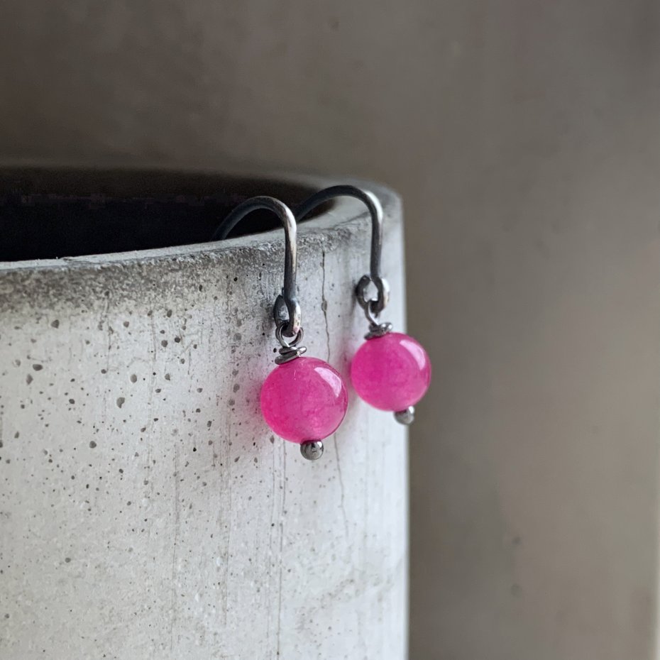 Kolczyki ze srebra i kamieni. Drobne kuleczki agatu, gładko szlifowane, o lekko szklistej, przejrzystej strukturze. Barwa kamieni to róż z nutami fuksji. Urodę kamieni podkreślają proste, oksydowane i lekko przetarte bigle. Bigle typu haki ze srebra 925. Średnica kuleczek to ok. 6 mm. Kolczyki mają długość ok. 3,5 cm.