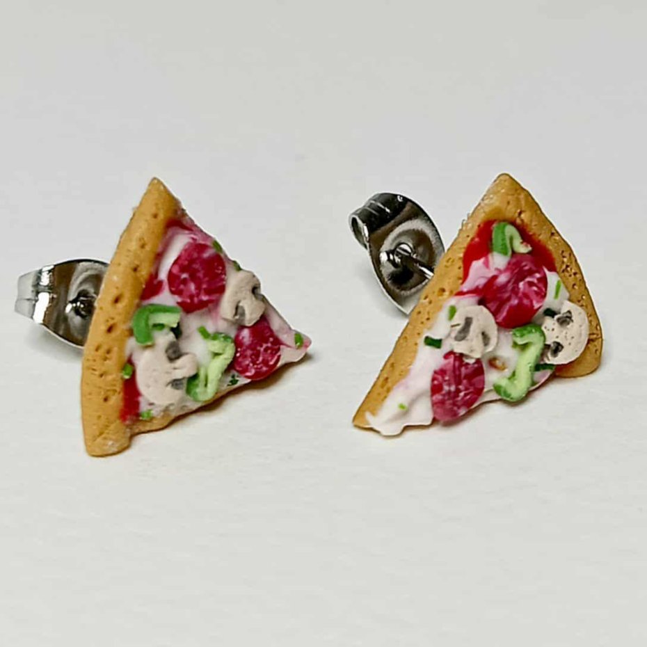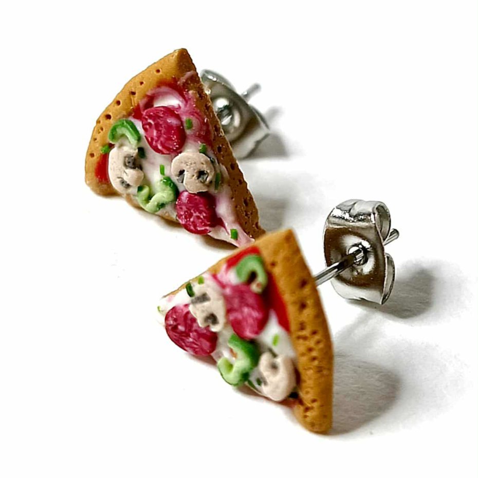 Urocze kolczyki w kształcie kawałków pizzy ???? wykonane ręcznie z modeliny. Każdy detal – ser, pieczarki, papryka i pepperoni – został stworzony z dbałością o szczegóły. Kolczyki są lekkie, wygodne i idealne dla osób, które lubią oryginalną biżuterię z humorem.
