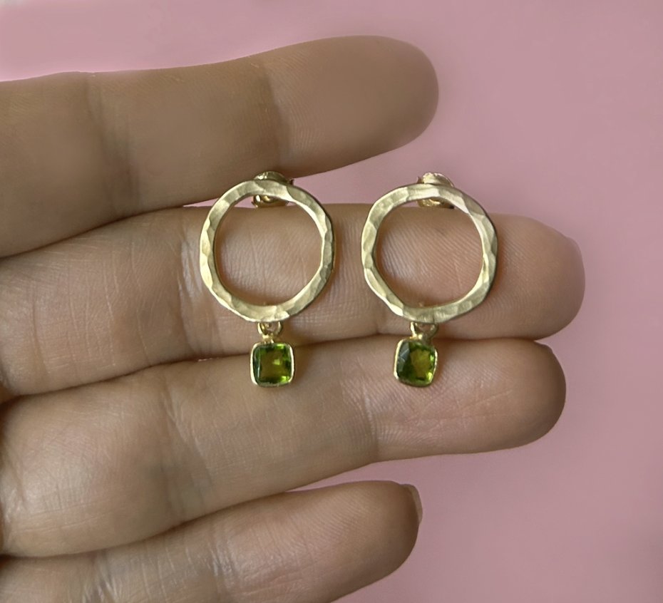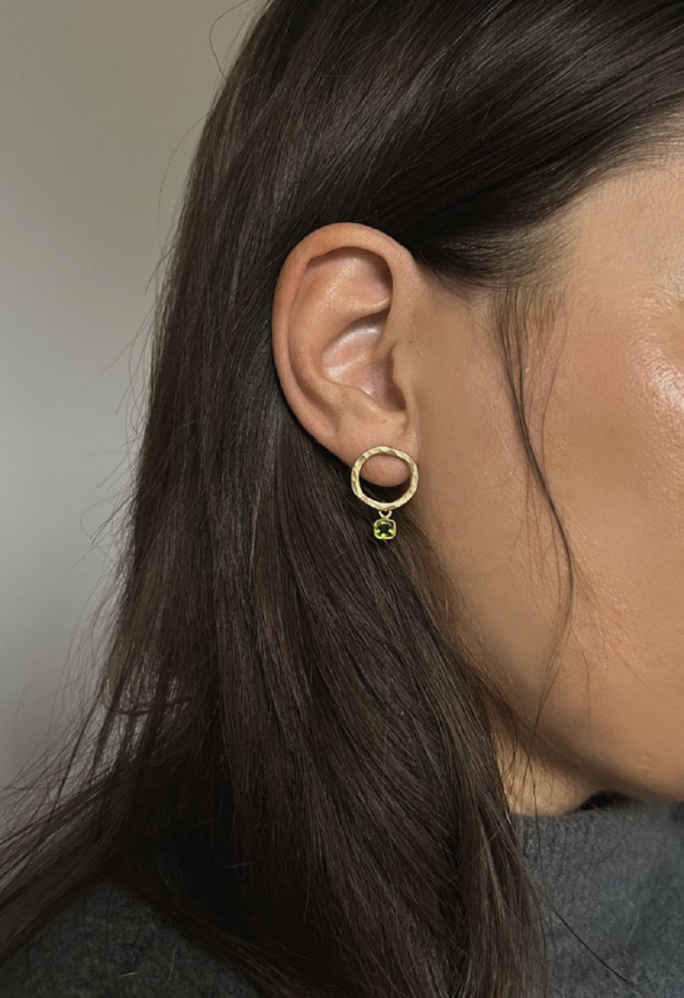 Okrągłe kolczyki ręcznie wykonane ze srebra próby 925, pokryte 24-karatowym złotem oraz naturalnym kamieniem peridot. Kamień o pięknym, intensywnie zielonym odcieniu, w delikatnej oprawie, doskonale współgra ze złotem, nadając biżuterii wyjątkowy charakter. Powierzchnia kolczyków jest młotkowana, co nadaje im ciekawą nieregularną fakturę, tworząc efekt subtelnego połysku i cienia. Dzięki temu każdy z kolczyków jest niepowtarzalny. Całość zapakowana w oryginalne, różowe pudełko, które sprawia, że biżuteria idealnie nadaje się na prezent – zarówno dla siebie, jak i bliskiej osoby.