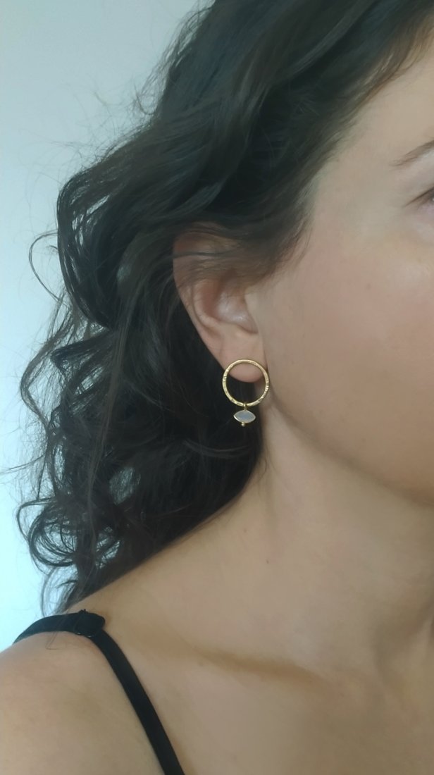 Okrągłe kolczyki wykonane w całości ręcznie ze srebra pr. 925 pokryte 24K złotem oraz naturalnego kamienia w oprawie - różowy kryształ górski.