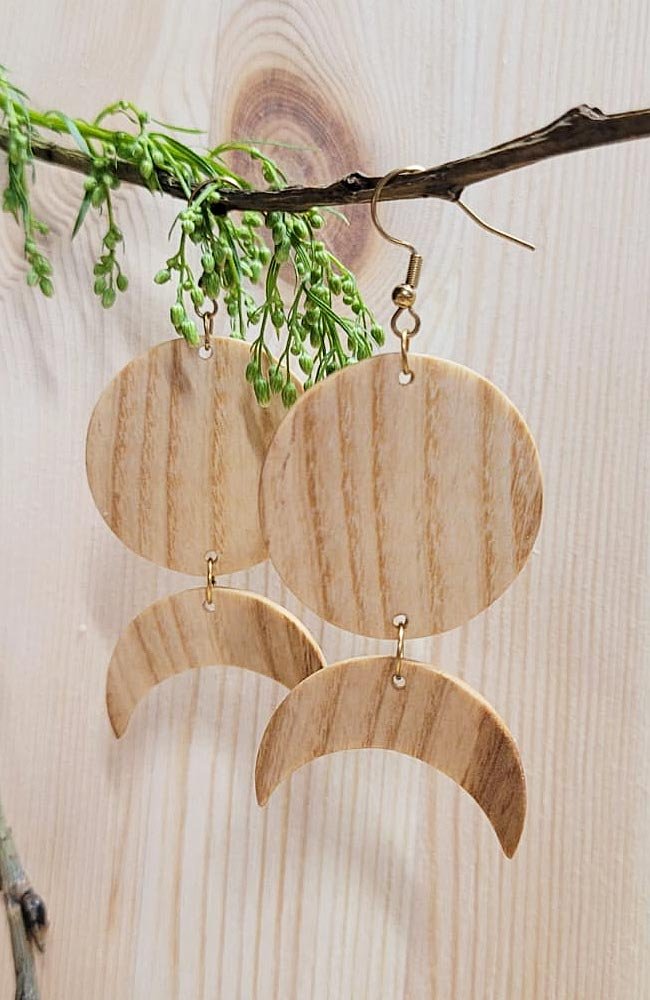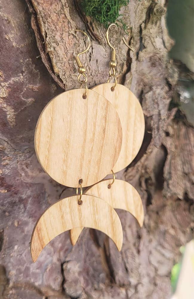 Kolczyki w stylu boho wykonane ręcznie z drewna jesionowego lub z egzotycznego drewna cumaru (do wyboru). Elementy drewniane starannie szlifujemy i zabezpieczamy olejem.