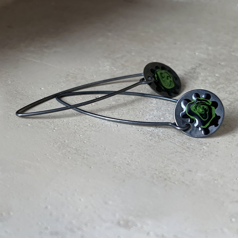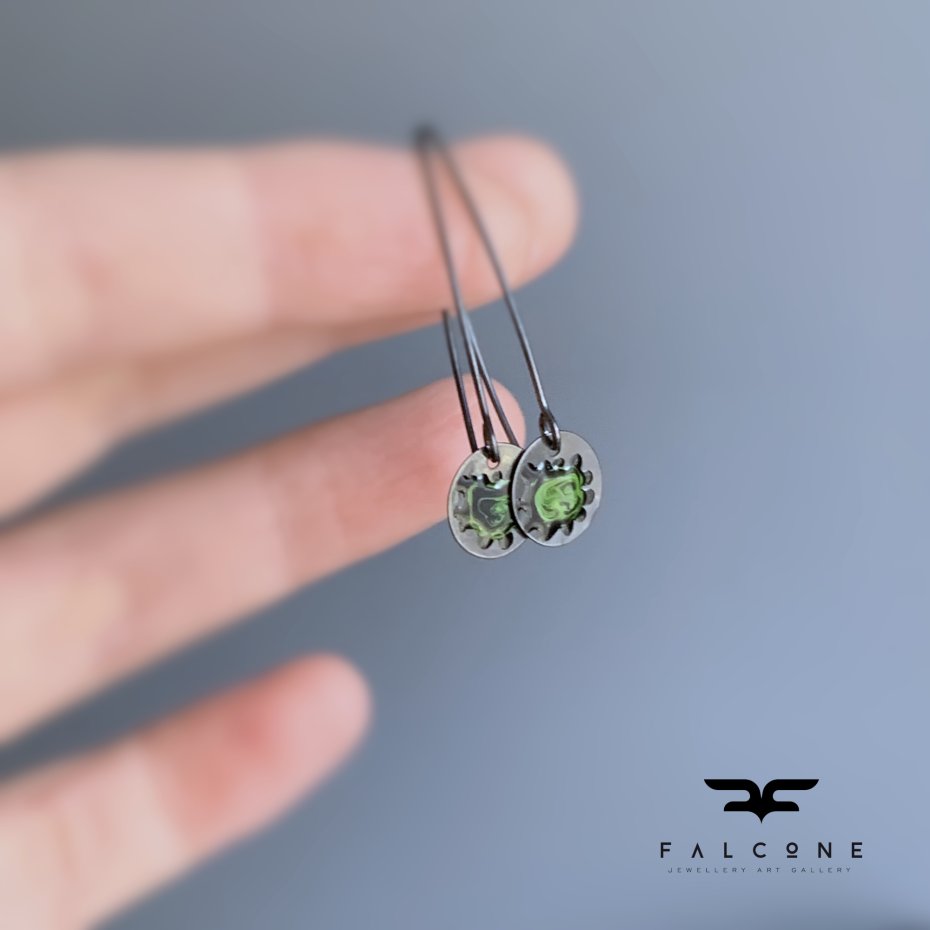 Kolczyki ze srebra z motywem kwiatowym. Ręcznie zdobione emaliowanymi kwiatami w egzotyczny wzór drobnych kwiatów. Kolorystyka kwiatów to czerń, zestawiona z zielenią w odcieniu mchu. Kolczyki są drobne, z akcentem kolorystycznym, który kontrastuje z ciemną barwą oksydowanego srebra. Całość dopełniają długie, efektowne bigle typu rybki ze srebra 925. Średnica srebrnych miseczek z motywem kwiatowym to ok. 1 cm. Długość kolczyków to ok. 4 cm.