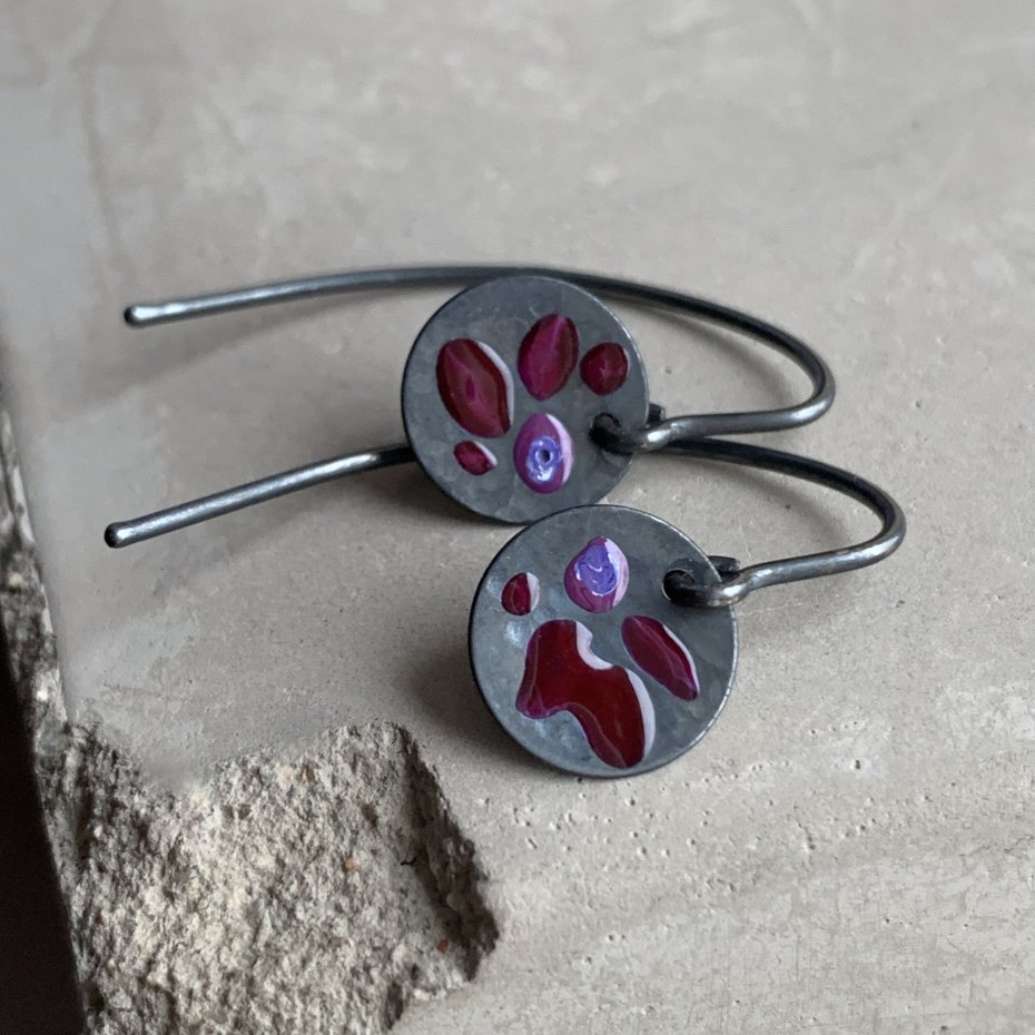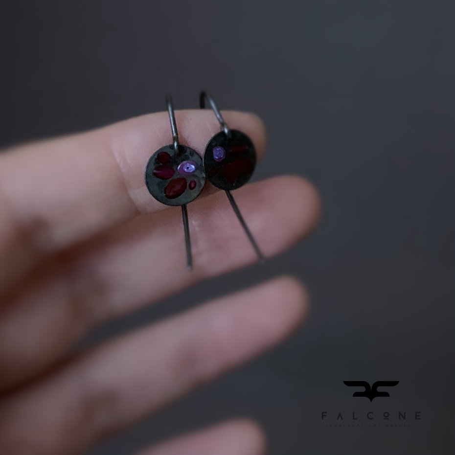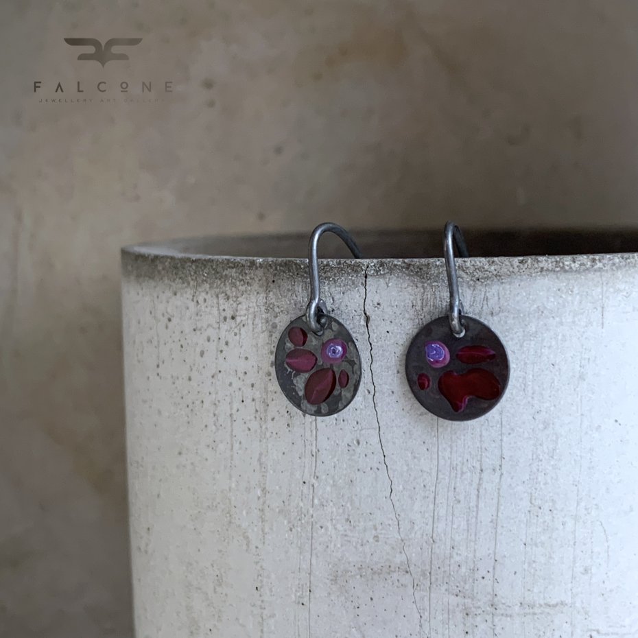 Kolczyki ze srebra z motywem kwiatowym. Drobne, subtelne kolczyki utrzymane w ciemnej tonacji. Ręcznie zdobione emalią w malowniczy, kwiatowy, niejednolity wzór. Kolorystyka drobnych kwiatów to ciemne rubinowe płatki, ze środkami w tonacjach fioletu z jaśniejszymi akcentami. Kompozycję dopełniają elementy z oksydowanego, przyciemnianego srebra. Bigle typu haki ze srebra 925. Średnica srebrnych miseczek z motywem kwiatowym to 1 cm. Długość kolczyków to ok 3 cm.