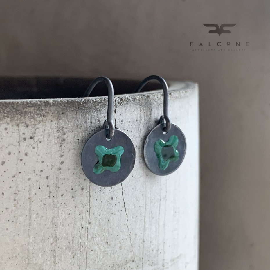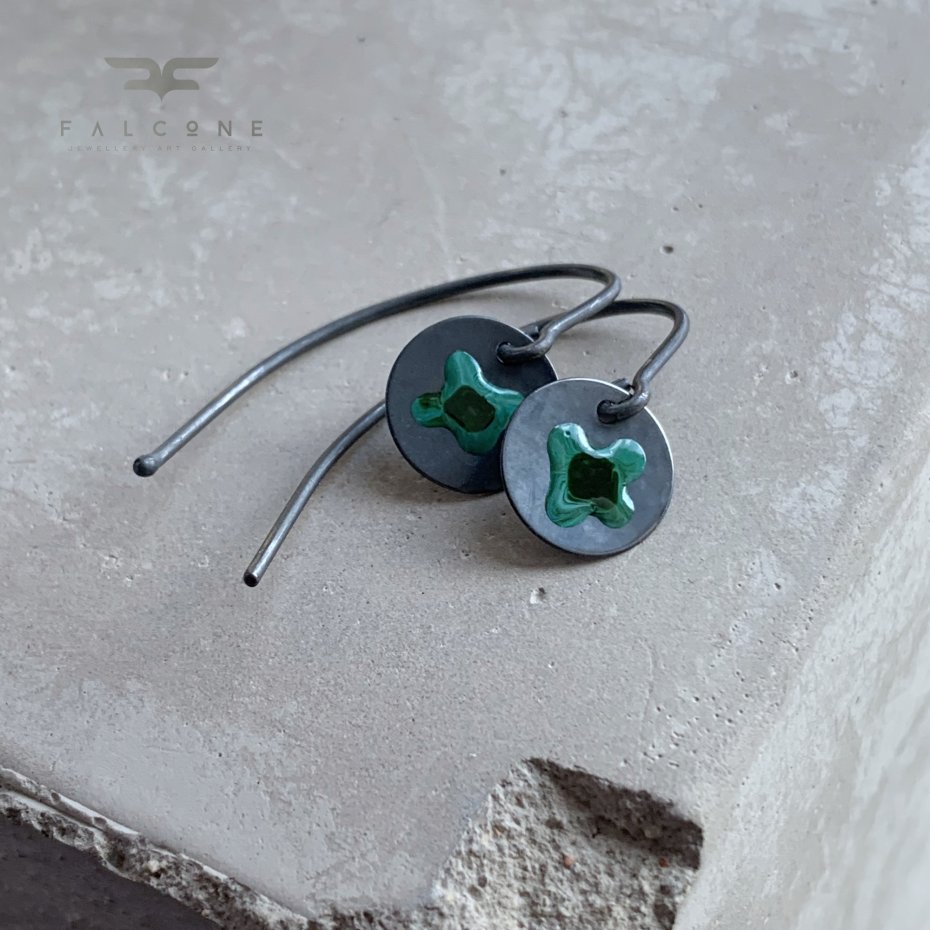 Kolczyki ze srebra z motywem kwiatowym. Drobne kolczyki, zdobione ręcznie emaliowanymi kwiatami w niejednolity, malowniczy wzór. Kolorystyka kwiatów to ciemny turkus w połączeniu z kontrastującym akcentem czerni. Kolczyki są drobne, ciemne, z subtelnym akcentem kolorystycznym. Średnica srebrnych miseczek z motywem kwiatowym to 1 cm. Bigle typu haki ze srebra 925. Długość kolczyków to ok. 3 cm.