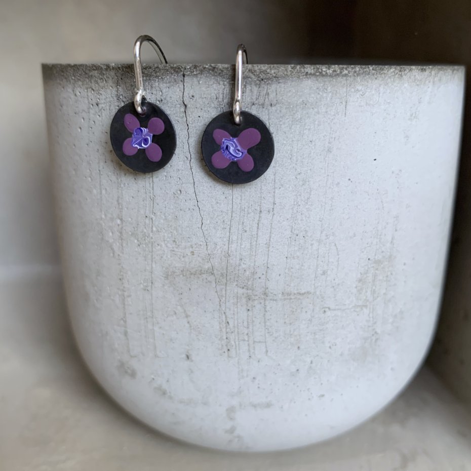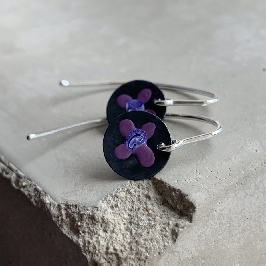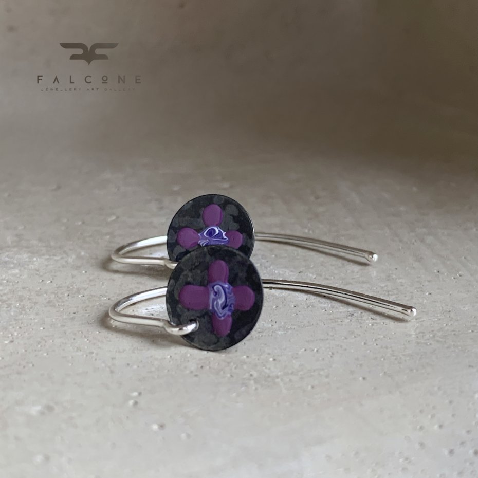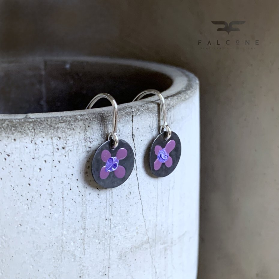 Kolczyki ze srebra z motywem kwiatowym. Drobne kolczyki, zdobione ręcznie emaliowanymi kwiatami, naniesionymi tak, by tworzyły malowniczy, niejednolity kolorystycznie wzór. Kolorystyka kwiatów to zgaszony fiolet płatków w połączeniu z ciemnym fioletem z białymi nakrapianiami. Barwy kwiatów są przygaszone, nieco wytrawne. Kolczyki są drobne, ciemne, z subtelnym akcentem kolorystycznym. Średnica srebrnych miseczek z motywem kwiatowym to 1 cm. Bigle typu haki ze srebra 925. Długość kolczyków to ok. 3 cm. Pojedynczy egzemplarz.