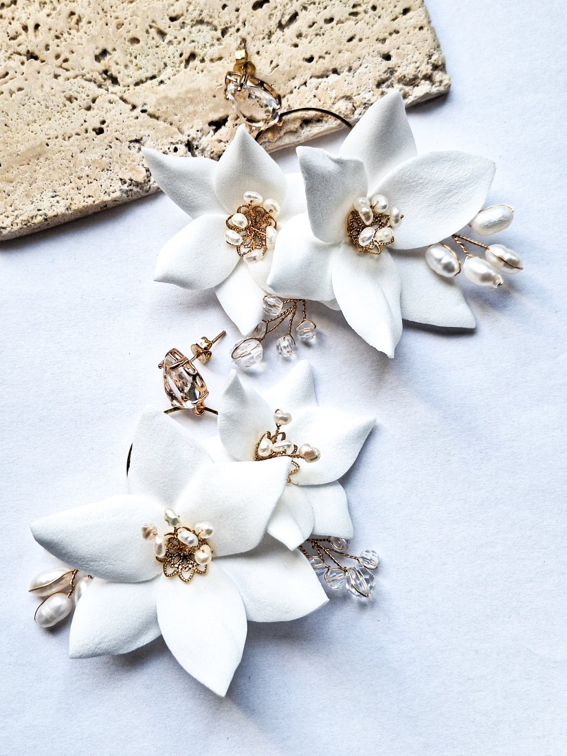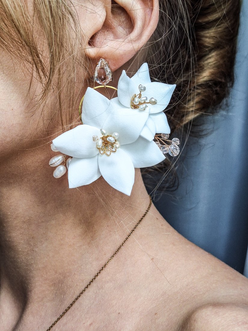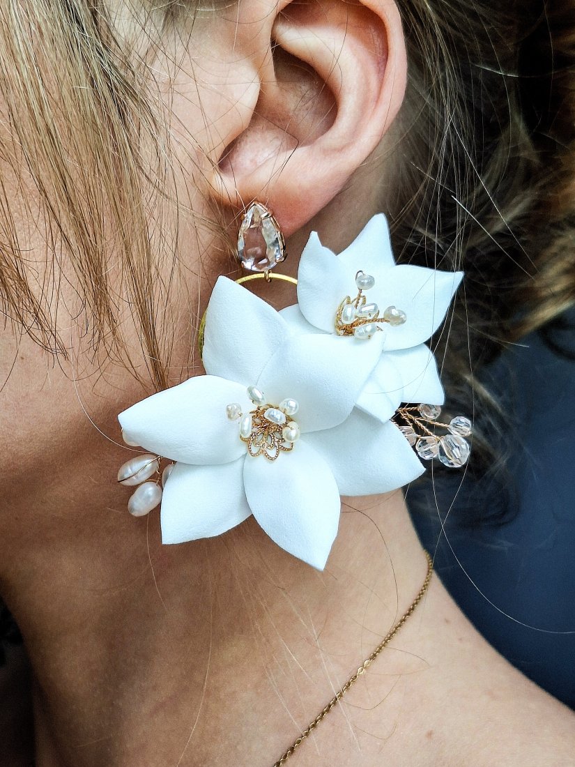Te wyjątkowe kolczyki ślubne zostały ręcznie wykonane z lekkiego foamiranu, dzięki czemu są niezwykle wygodne nawet przez cały dzień noszenia. Ich kwiatowa forma w połączeniu z naturalnymi perłami i kryształowymi detalami tworzy zjawiskową, a jednocześnie subtelną kompozycję, idealną dla panny młodej.
