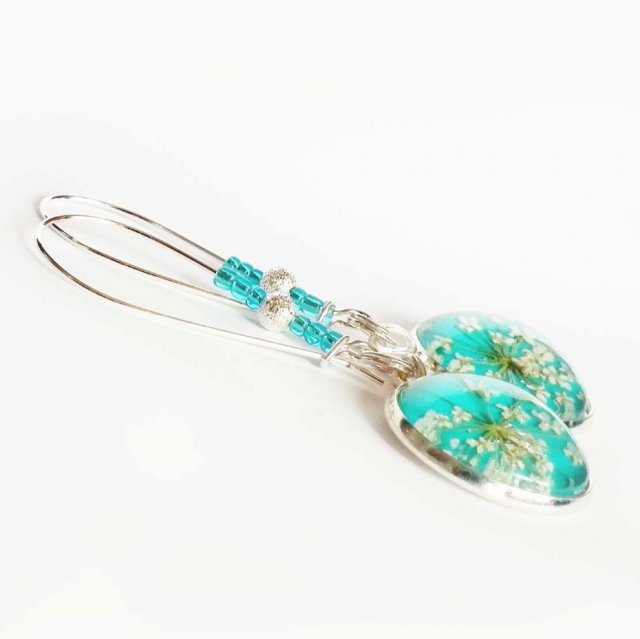 Efektowne kolczyki z prawdziwymi suszonymi kwiatami zatopionymi w żywicy w oprawie w kolorze srebra. Bigle zapinane, antyalergiczne w kolorze srebrnym z ozdobą w postaci koralików ze szkła.