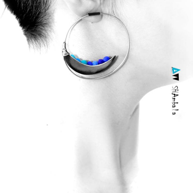 Awangardowe kolczyki - groszki - koła na sztyft. Dynamiczna, fantazyjna forma kolczyków oraz ich figlarny charakter powodują, że stają się one niezwykle ekstrawaganckie. Kolczyki wykonane zostały ze srebra oraz tworzywa akrylowego starannie zabarwionego przeze mnie na różne odcienie granatu, ultramaryny i turkusu. Istnieje możliwość przesuwania zapięcia po obręczy, dzięki czemu możemy ustawić groszki w różnych pozycjach.