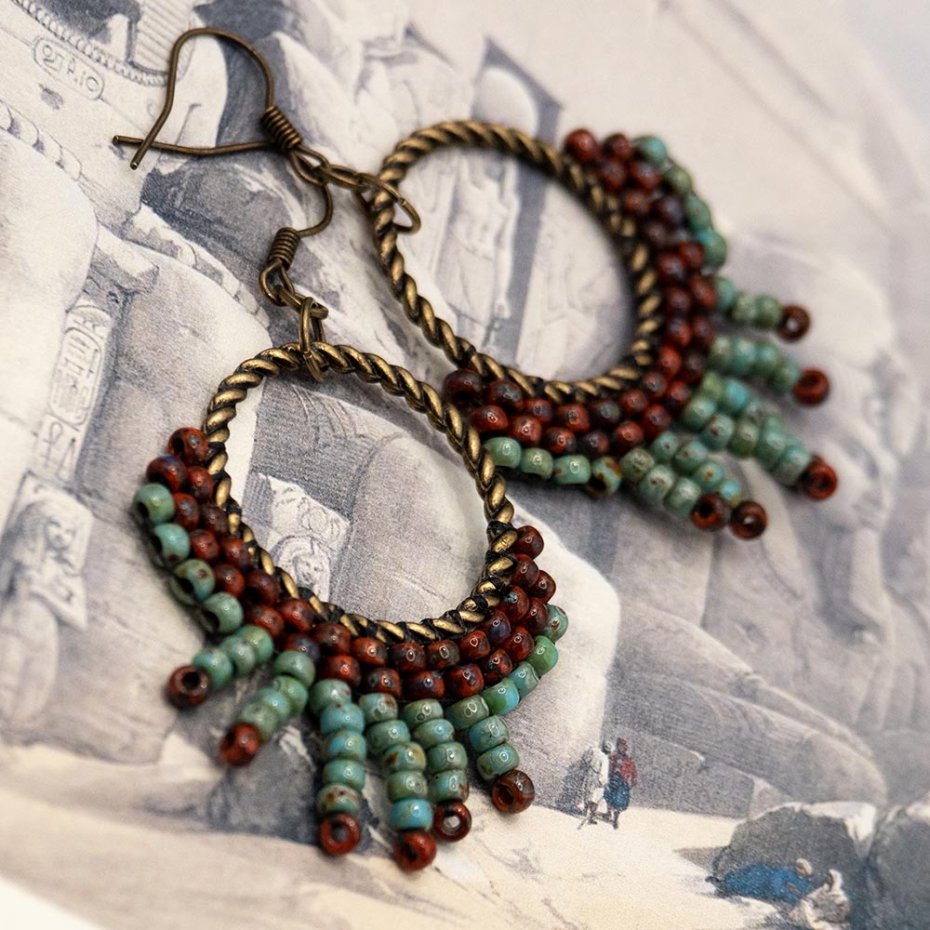 Wiszące kolczyki z drobnymi koralikami i elementami metalowymi w kolorze starego brązu.