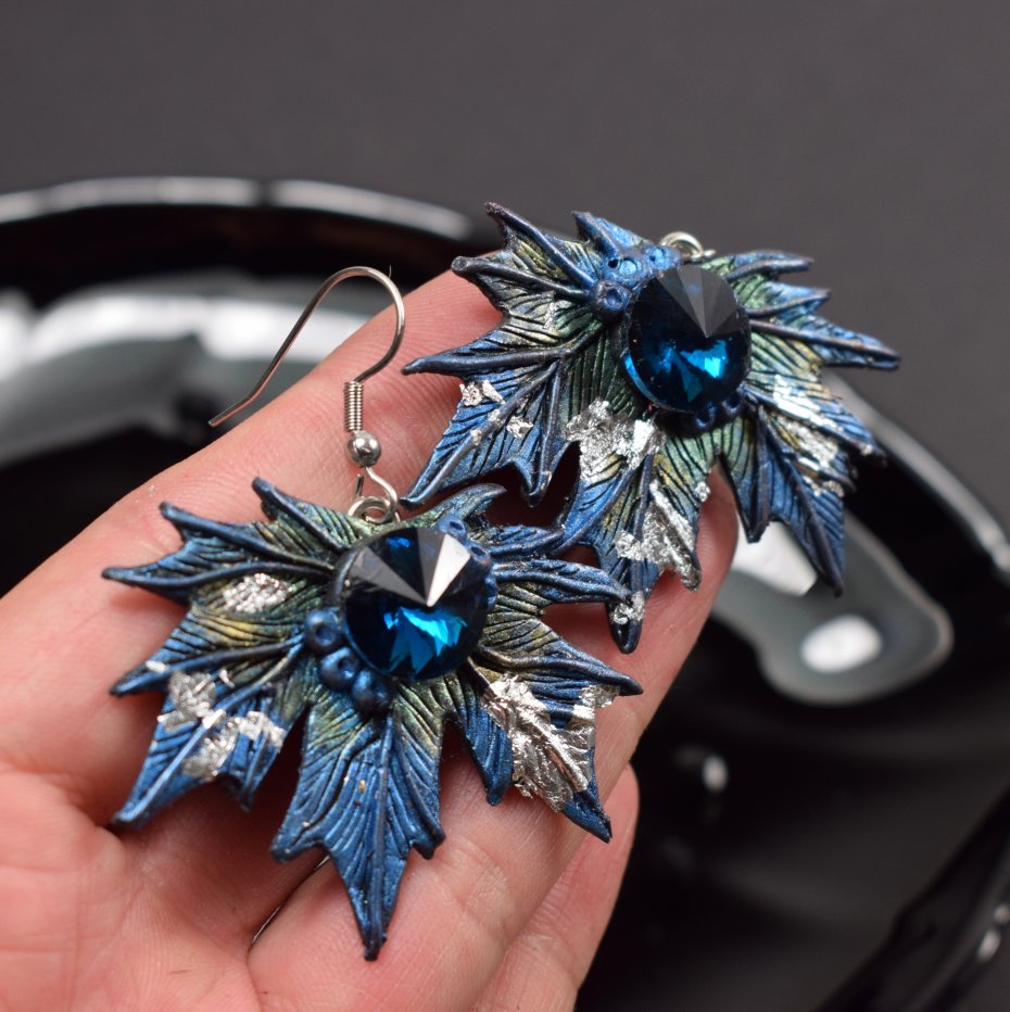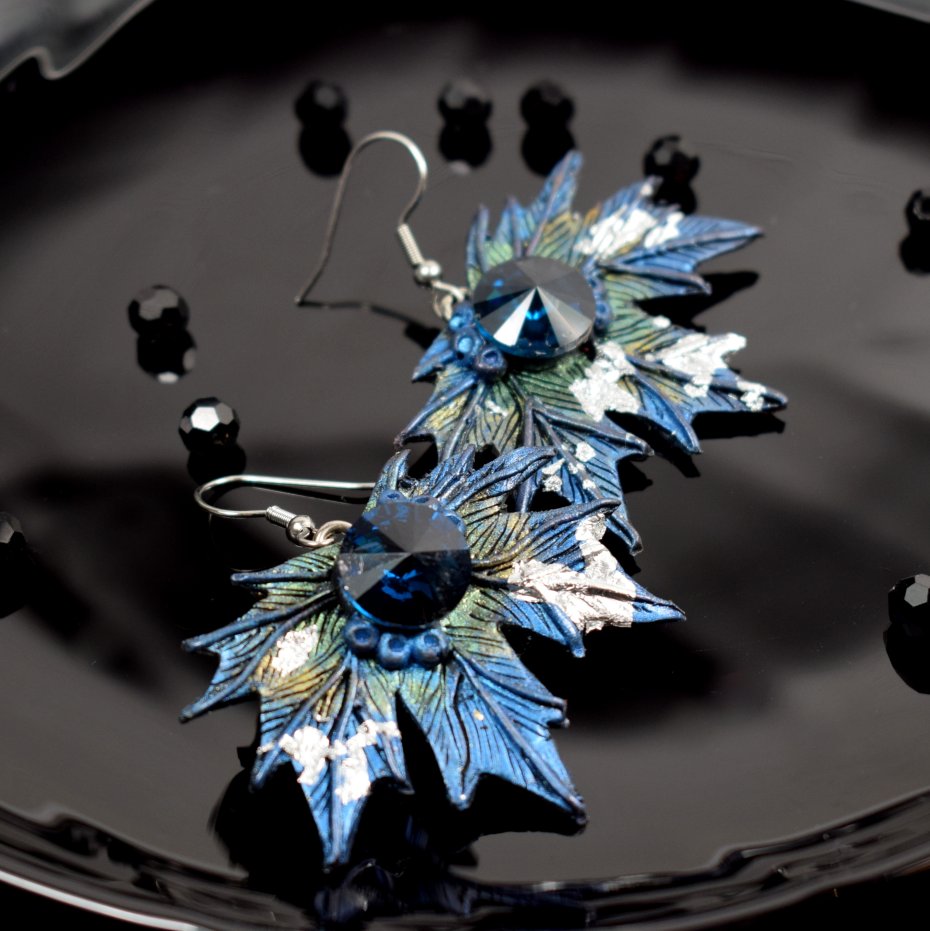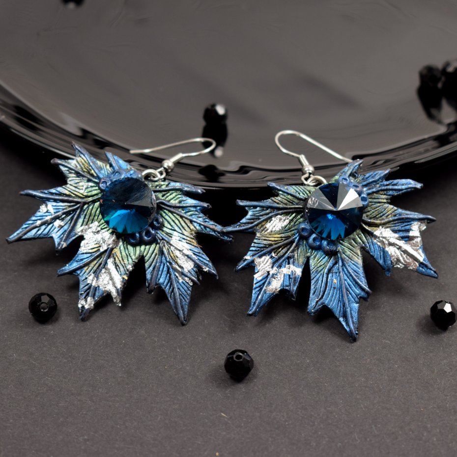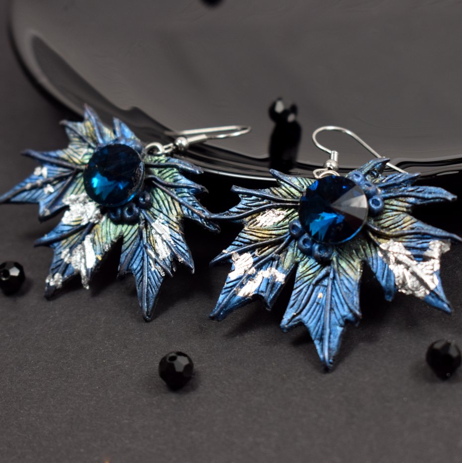 Kolczyki w formie liści klonu, utrzymane w odcieniach srebrzystego błękitu i zieleni.